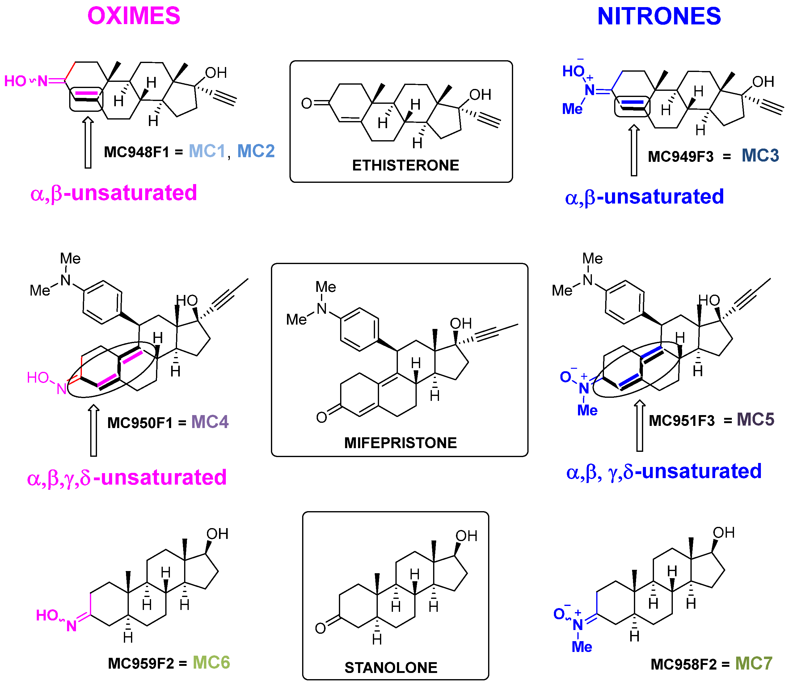 Figure 1. Structure of ethisterone, mifepristone, stanolone, and their corresponding oxime and nitrone derivatives.