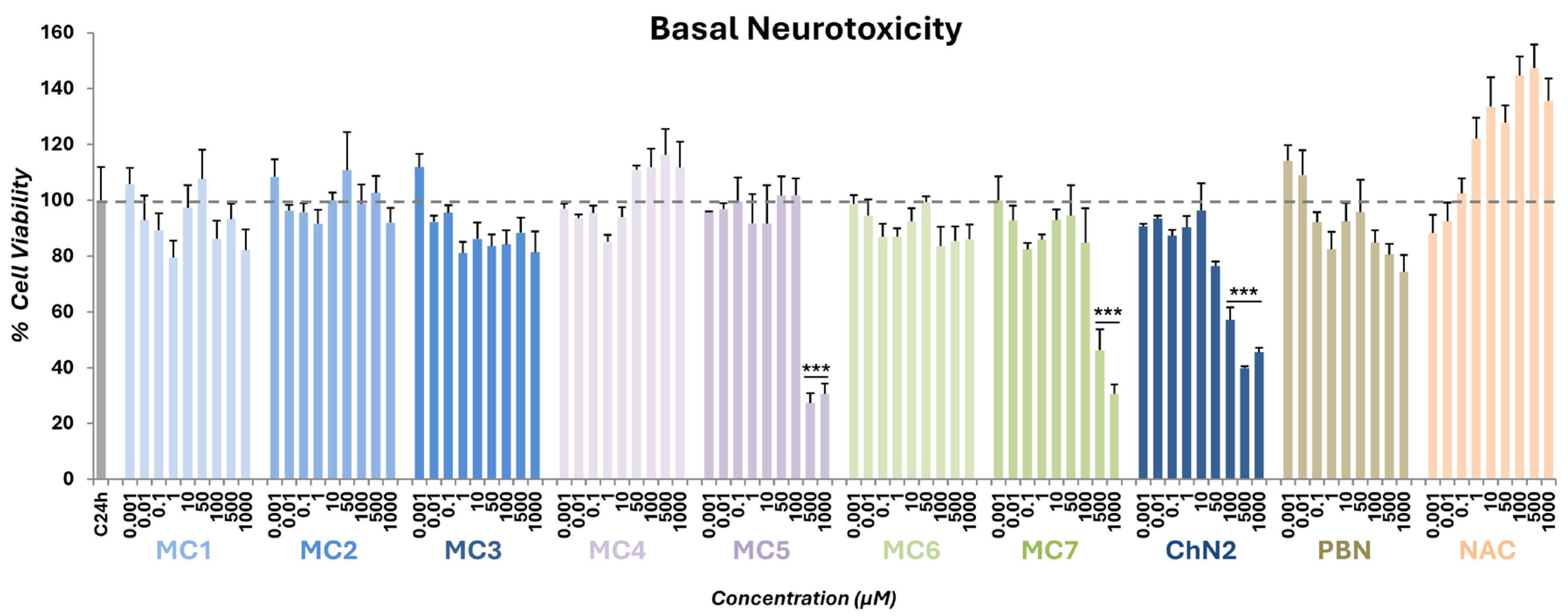 Figure 2. Effect of MC1–7, ChN2, PBN, and NAC on SH-SY5Y human neuroblastoma cell viability under basal conditions. The bars represent the % of cell viability at the indicated concentrations of the compounds. The viability of untreated cells (C24h) was set at 100% (100 ± 11.9%; mean ± SEM) (dotted line). Data are shown as means ± SEM of three independent experiments performed in triplicate. The statistical analysis (one-way ANOVA) reveals significant differences in viability compared to C24h (*** p < 0.001). Statistical analysis of results exceeding 100% is not displayed.