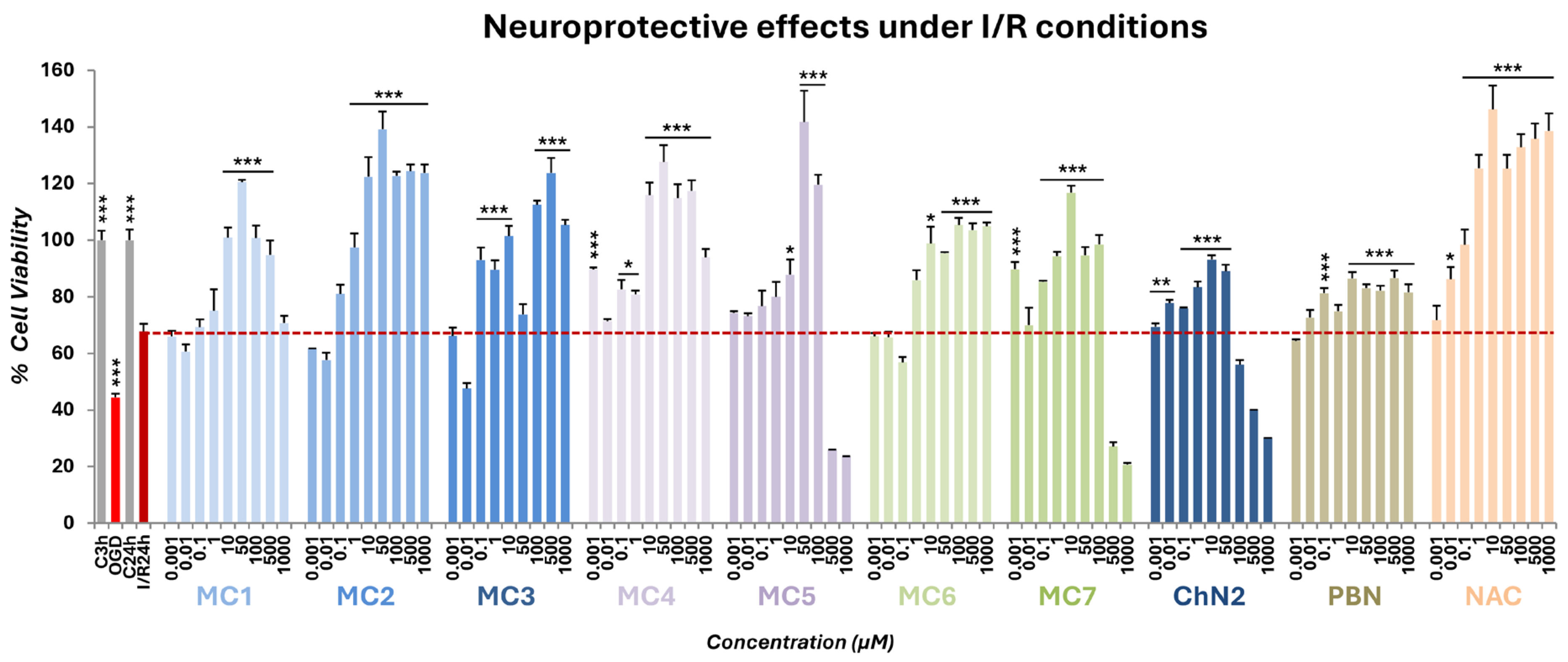 Figure 3. Neuroprotective effects of MC1–7, ChN2, PBN, and NAC against the reduction in metabolic capacity induced by oxygen–glucose deprivation (OGD) (3 h) followed by 24 h of oxygen and glucose resupply (I/R, dotted line) in SH-SY5Y human neuroblastoma cells. C denotes control cells maintained under standard conditions of oxygen and glucose. C3h corresponds to the control condition for OGD, and C24h corresponds to the control condition for I/R. The bars represent the % of cell viability at the indicated concentrations of the compounds. Data are shown as means ± SEM of three independent experiments performed in triplicate. The statistical analysis (one-way ANOVA followed by Holm–Sidak post hoc test) reveals significant differences in viability compared to the I/R condition (* p < 0.05; ** p < 0.01; *** p < 0.001).