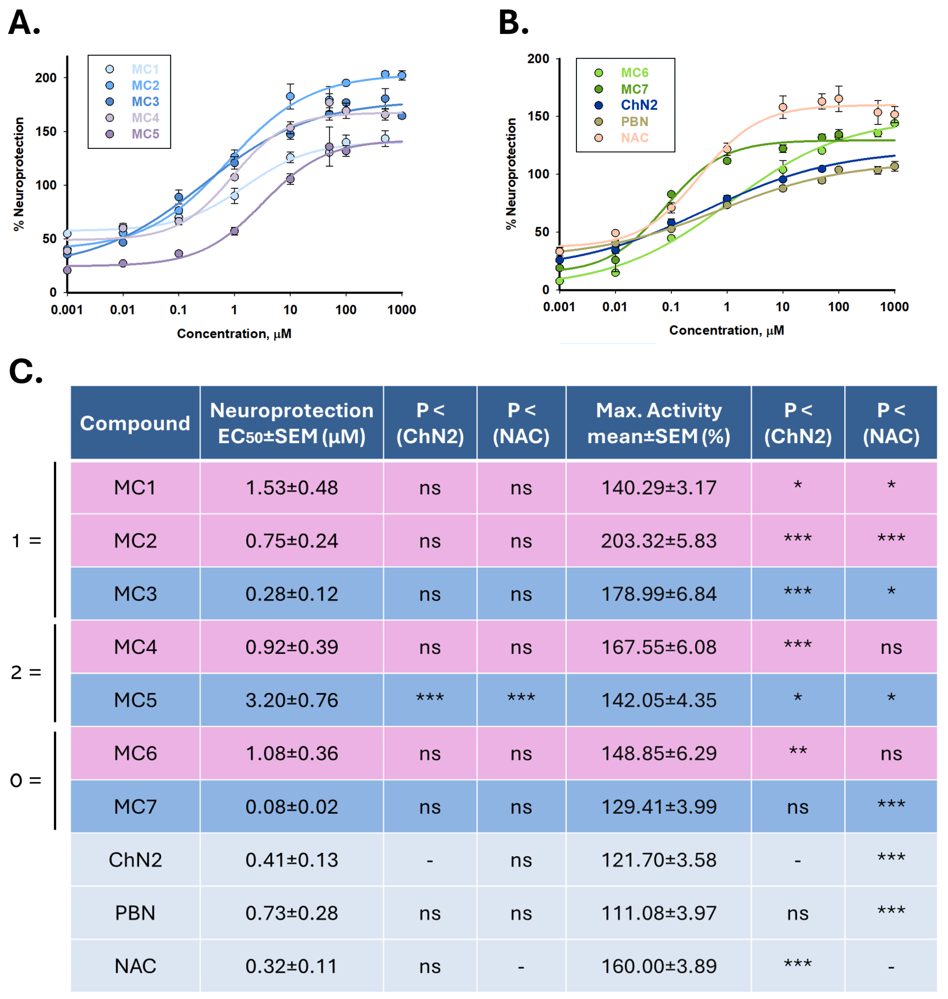 Figure 4. Neuroprotective effects of MC1–7, ChN2, PBN, and NAC in SH-SY5Y cells following I/R exposure. (A,B) Concentration–response curves showing the percentage of neuroprotection of each compound at the indicated concentrations. The curves were fitted using non-linear weighted regression analysis to estimate the effective dose 50 (EC50) and maximal neuroprotective activity (MNA) values. Data represent the means ± SEM of three independent experiments, each performed in triplicate. (C) EC50 and MNA values of the tested compounds. Rows highlighted in pink correspond to oximes, those in dark blue to nitrones, and the remaining to the three reference compounds. The structural labels 0 =, 1 =, and 2 = indicate the number of conjugated double bonds in the molecules: 0 = no double bonds, 1 = one double bond, 2 = two double bonds. Columns “p < (ChN2)” and “p < (NAC)” indicate the significance of the difference relative to ChN2 and NAC, respectively. * p < 0.05, ** p < 0.01, and *** p < 0.001; ns: not statistically significant (one-way ANOVA with Holm–Sidak post hoc test).