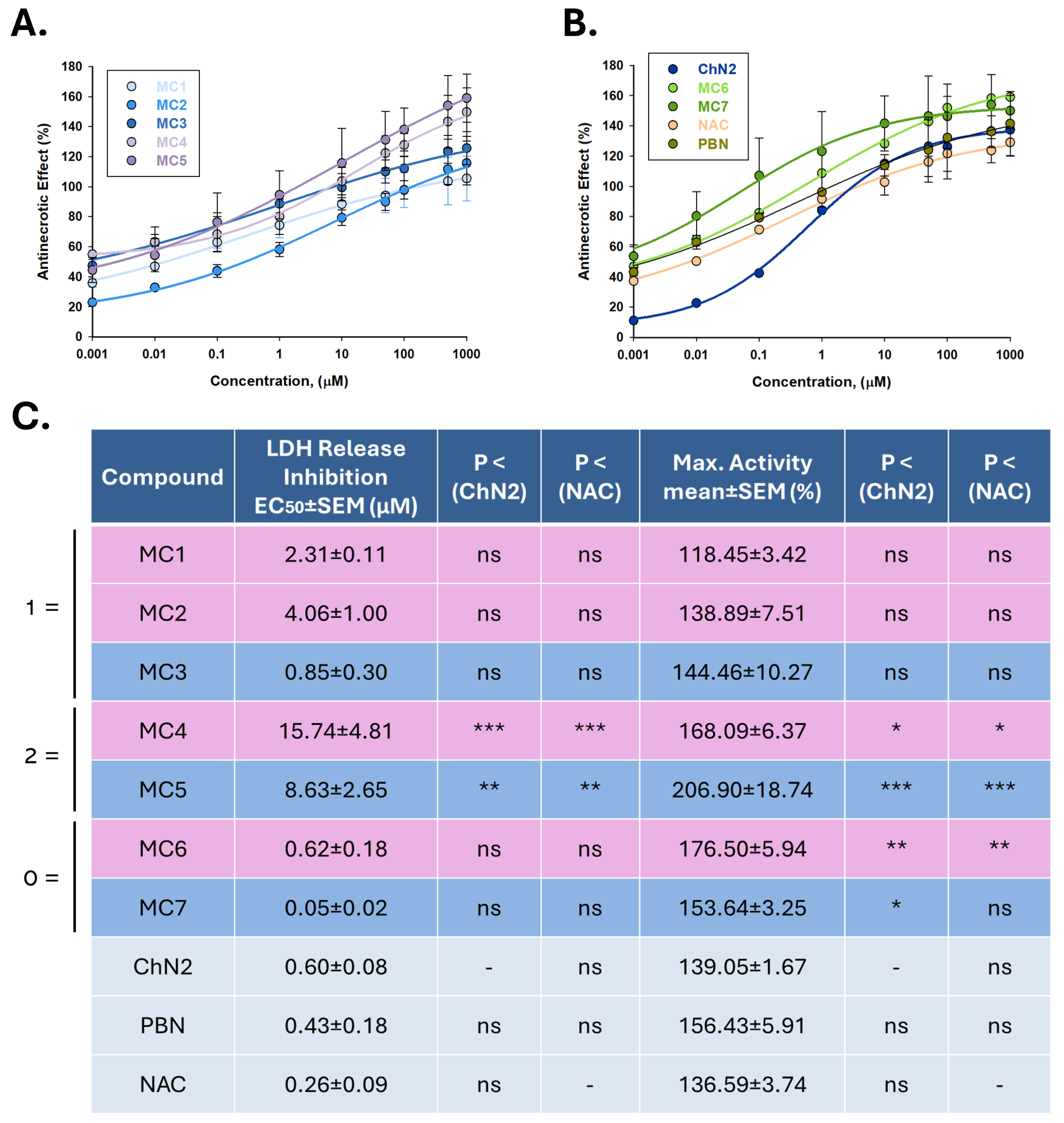 Figure 6. Anti-necrotic effects of MC1–7, ChN2, PBN, and NAC in SH-SY5Y cells following I/R exposure. (A,B) Concentration–response curves showing the percentage of anti-necrotic activity of each compound at the indicated concentrations. The curves were fitted using non-linear weighted regression analysis to estimate the effective dose 50 (EC50) and maximal anti-necrotic activity (MANA) values. Data represent the means ± SEM of three independent experiments, each performed in triplicate. (C) EC50 and MANA values of the tested compounds. Rows highlighted in pink correspond to oximes, those in dark blue to nitrones, and the remaining to the three reference compounds. The structural labels 0 =, 1 =, and 2 = indicate the number of conjugated double bonds in the molecules: 0 = no double bonds, 1 = one double bond, 2 = two double bonds. Columns “p < (ChN2)” and “p < (NAC)” indicate the significance of the difference relative to ChN2 and NAC, respectively. * p < 0.05, ** p < 0.01, and *** p < 0.001; ns: not statistically significant (one-way ANOVA with Holm–Sidak post hoc test).