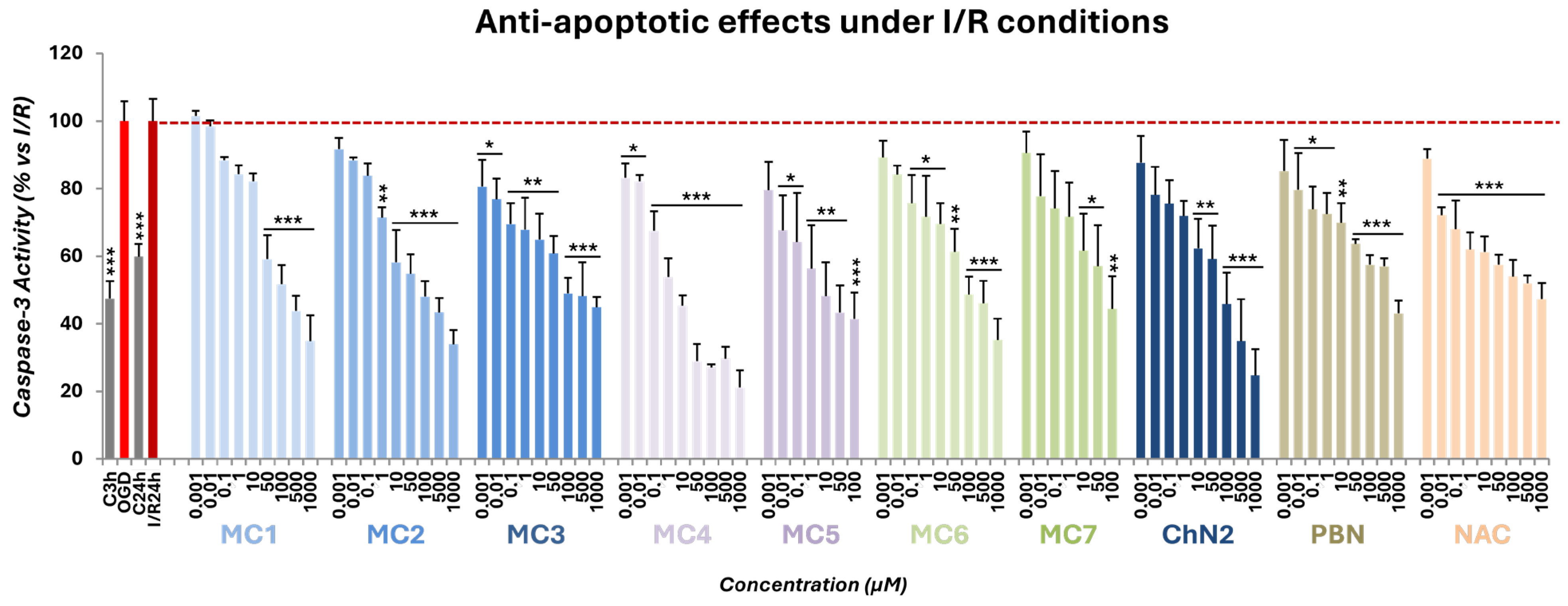 Figure 7. Anti-apoptotic effects of MC1–7, ChN2, PBN, and NAC in SH-SY5Y human neuroblastoma cells following OGD (3 h) and subsequent I/R (24 h) (dotted line). C denotes control cells maintained under standard conditions of oxygen and glucose. C3h corresponds to the control condition for OGD, and C24h corresponds to the control condition for I/R. The bars represent the % of caspase-3 activity under the indicated experimental conditions. Data are shown as means ± SEM of three independent experiments, each performed in triplicate. The statistical analysis (one-way ANOVA followed by Holm–Sidak post hoc test) reveals significant differences in caspase-3 activity compared to the I/R condition (* p < 0.05; ** p < 0.01; *** p < 0.001).