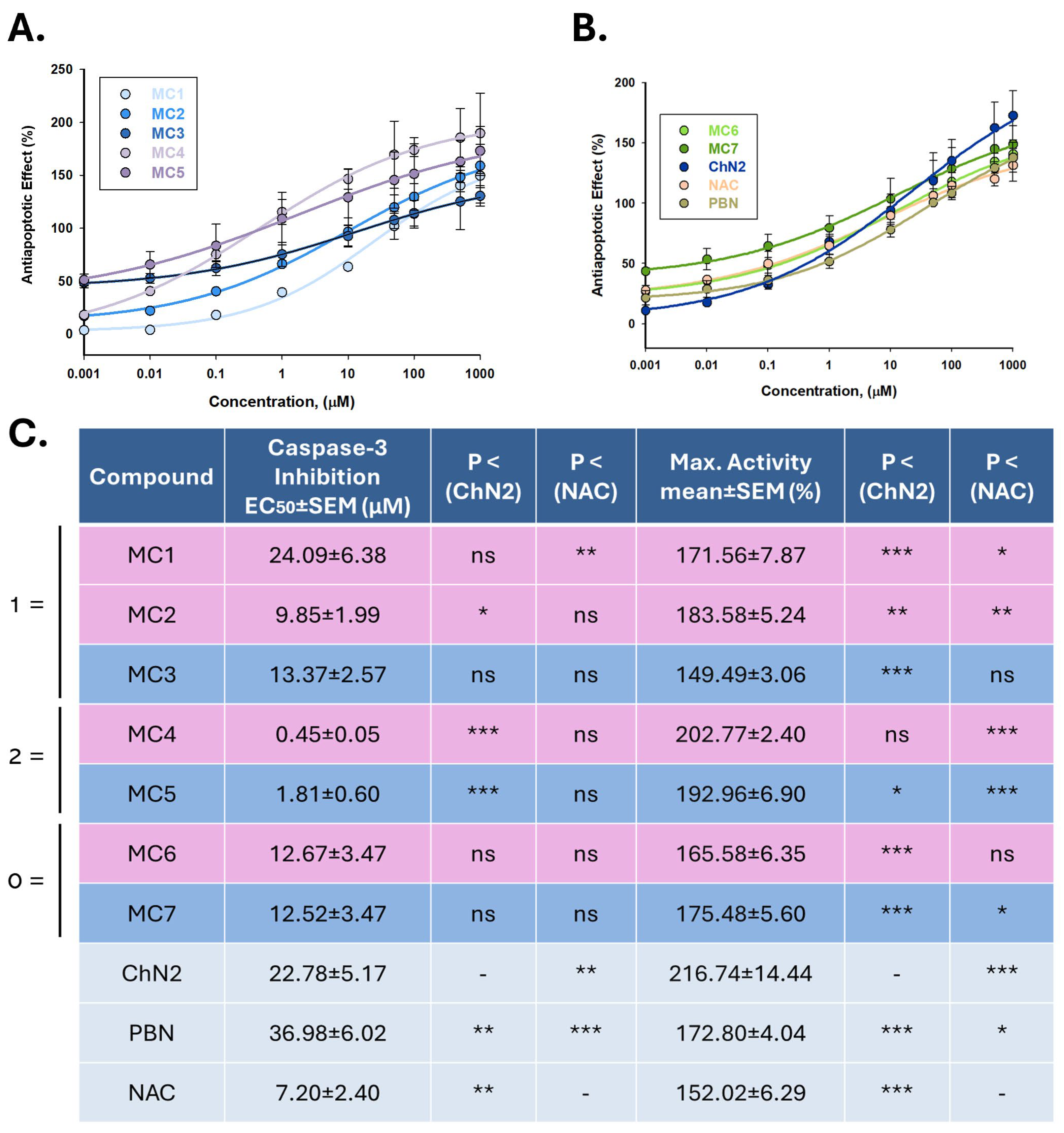 Figure 8. Anti-apoptotic effects of MC1–7, ChN2, PBN, and NAC in SH-SY5Y cells following I/R exposure. (A,B). Concentration–response curves showing the percentage of anti-apoptotic activity of each compound at the indicated concentrations. The curves were fitted using non-linear weighted regression analysis to estimate the effective dose 50 (EC50) and maximal anti-apoptotic activity (MAAA) values. Data represent the means ± SEM of three independent experiments, each performed in triplicate. (C) EC50 and MAAA values of the tested compounds. Rows highlighted in pink correspond to oximes, those in dark blue to nitrones, and the remaining to the three reference compounds. The structural labels 0 =, 1 =, and 2 = indicate the number of conjugated double bonds in the molecules: 0 = no double bonds; 1 = one double bond; 2 = two double bonds. Columns “p < (ChN2)” and “p < (NAC)” indicate the significance of the difference relative to ChN2 and NAC, respectively. * p < 0.05, ** p < 0.01, and *** p < 0.001; ns: not statistically significant (one-way ANOVA with Holm–Sidak post hoc test).