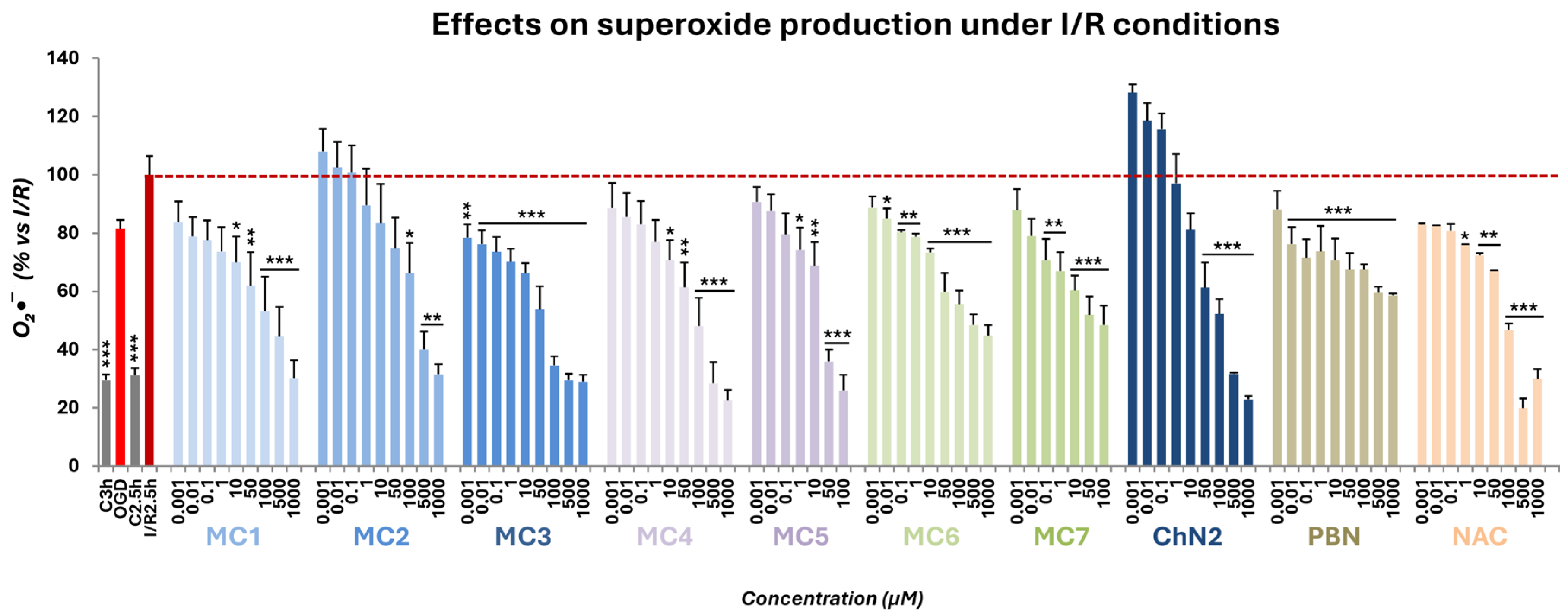 Figure 9. Effects of MC1–7, ChN2, PBN, and NAC on superoxide (O2) production in SH-SY5Y human neuroblastoma cells following OGD (3 h) and subsequent I/R (2.5 h) (dotted line). C denotes control cells maintained under standard conditions of oxygen and glucose. C3h corresponds to the control condition for OGD, and C2.5h corresponds to the control condition for I/R. The bars represent the % of superoxide anion (O2) generated under the indicated experimental conditions. Data are shown as means ± SEM of three independent experiments, each performed in triplicate. The statistical analysis (one-way ANOVA followed by Holm–Sidak post hoc test) reveals significant differences in O2 production compared to the I/R condition (* p < 0.05; ** p < 0.01; *** p < 0.001).