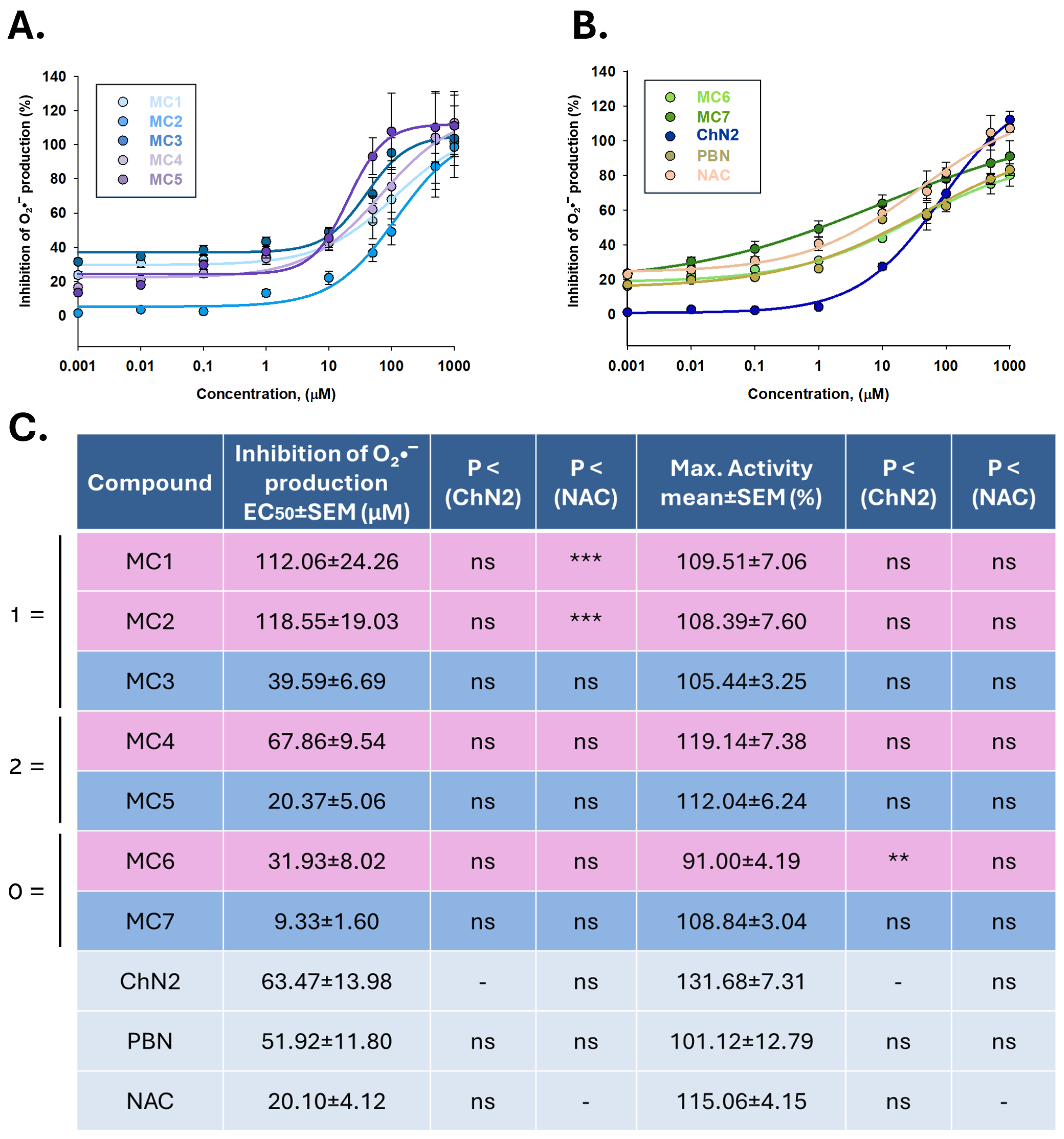 Figure 10. Inhibitory effects of MC1–7, ChN2, PBN, and NAC on superoxide (O2) production in SH-SY5Y cells following OGD (3 h) and subsequent reperfusion (2.5 h). (A,B) Concentration–response curves showing the percentage of antioxidant activity of each compound at the indicated concentrations. The curves were fitted using non-linear weighted regression analysis to estimate the effective dose 50 (EC50) and maximal antioxidant activity (MAOA) values. Data represent the means ± SEM of three independent experiments, each performed in triplicate. (C) EC50 and MAOA values of the tested compounds. Rows highlighted in pink correspond to oximes, those in dark blue to nitrones, and the remaining to the three reference compounds. The structural labels 0 =, 1 =, and 2 = indicate the number of conjugated double bonds in the molecules: 0 = no double bonds, 1 = one double bond, 2 = two double bonds. Columns “p < (ChN2)” and “p < (NAC)” indicate the significance of the difference relative to ChN2 and NAC, respectively. ** p < 0.01, and *** p < 0.001; ns: not statistically significant (one-way ANOVA with Holm–Sidak post hoc test).