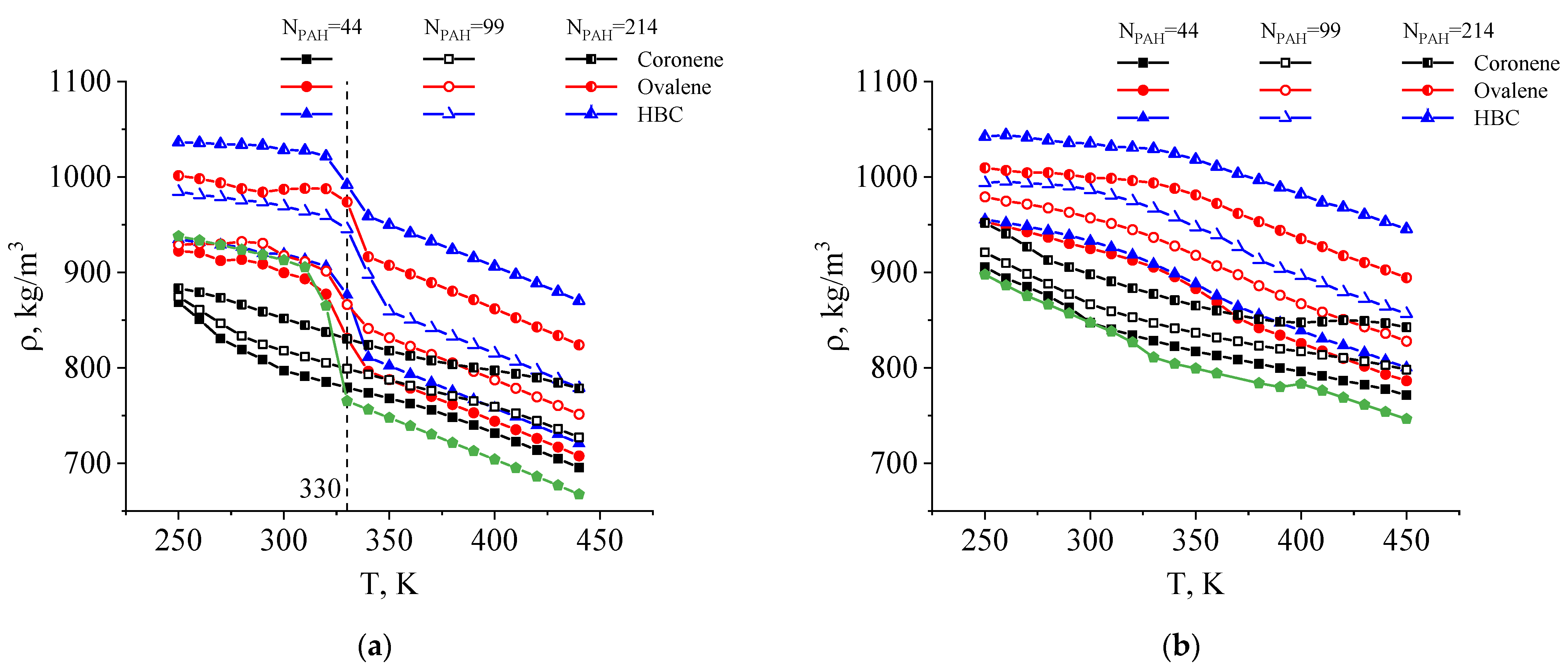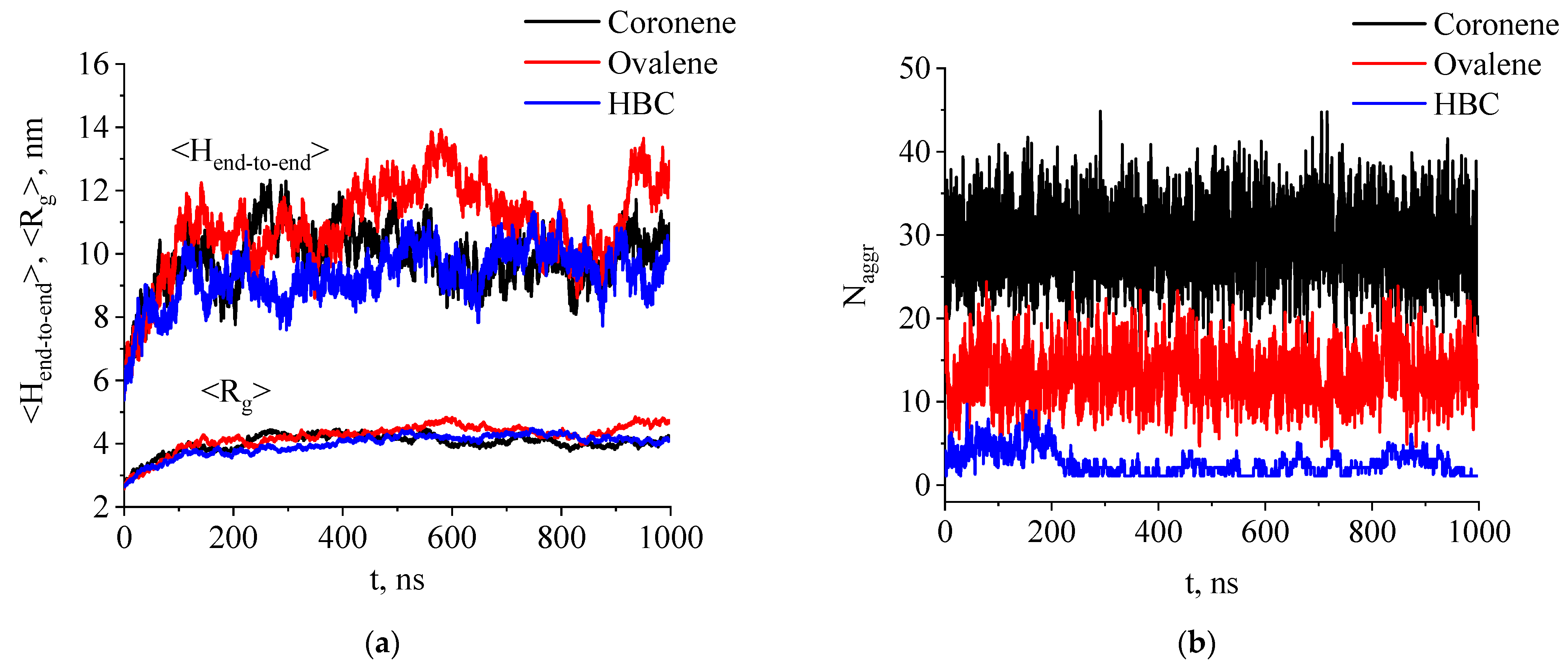 - Glova, A.D.; Nazarychev, V.M.; Larin, S.V.; Gurtovenko, A.A.; Lyulin, S.V. Size Matters: Asphaltenes with Enlarged Aromatic Cores Promote Heat Transfer in Organic Phase-Change Materials. Phys. Chem. Chem. Phys. 2023, 25, 32196–32207. [Google Scholar] [CrossRef]