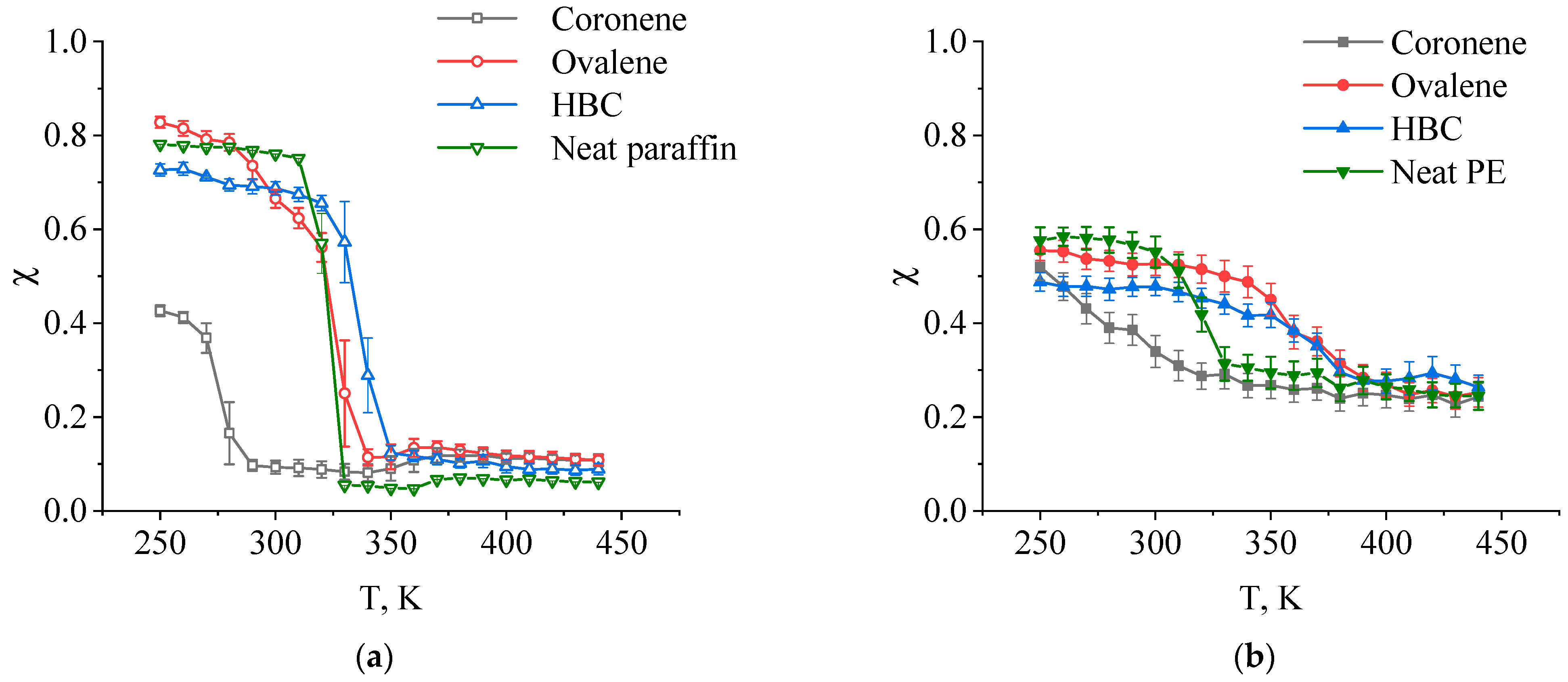 3.1. Aggregation Behavior of PAH in PE and Paraffin