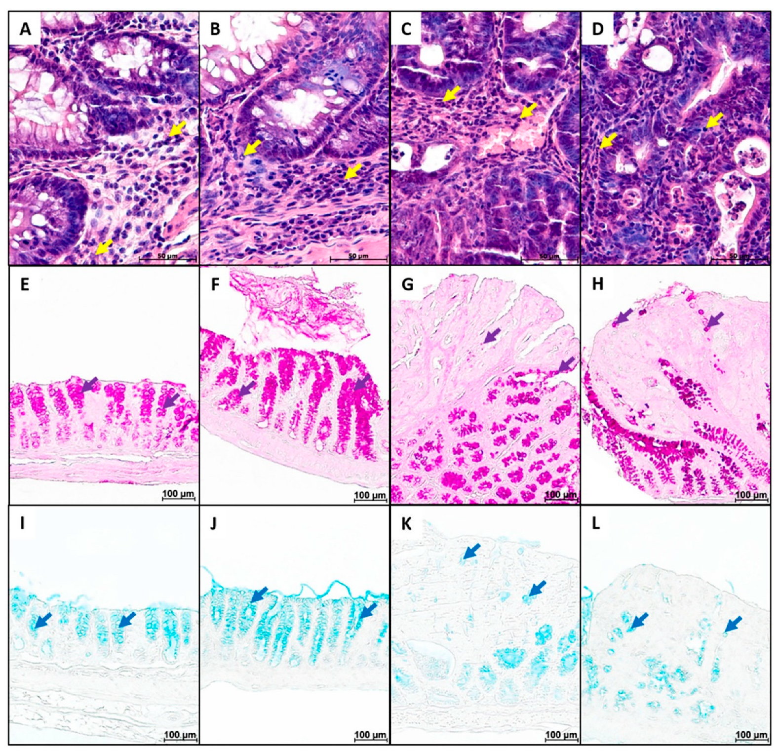 - Dzhalilova, D.; Zolotova, N.; Fokichev, N.; Makarova, O. Murine Models of Colorectal Cancer: The Azoxymethane (AOM)/Dextran Sulfate Sodium (DSS) Model of Colitis-Associated Cancer. PeerJ 2023, 11, e16159. [Google Scholar] [CrossRef]