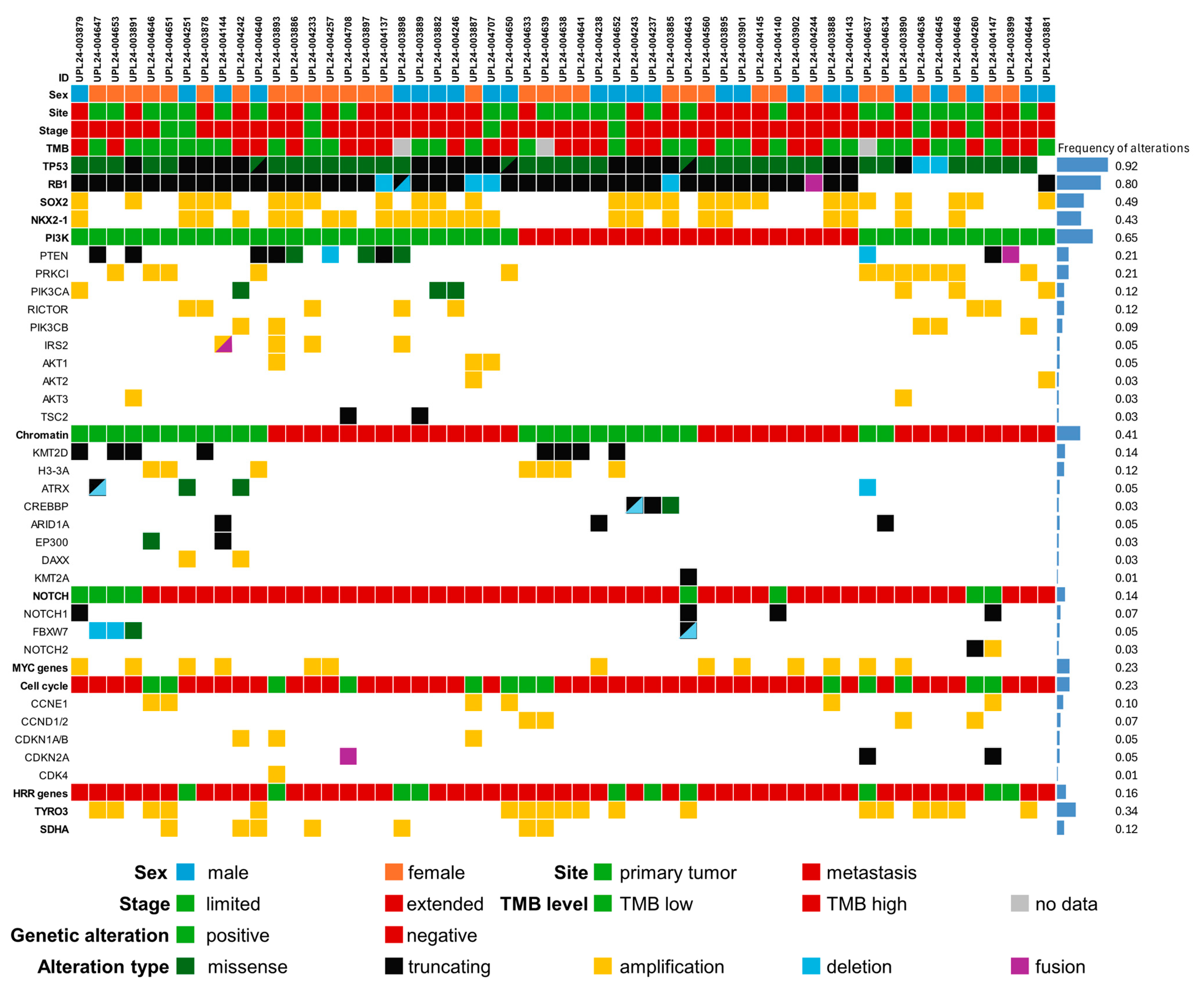 - Wu, S.; Zhang, Y.; Zhang, Y.; Chen, L.; Ouyang, H.; Xu, X.; Du, Y.; Ti, X. Mutational landscape of homologous recombination-related genes in small-cell lung cancer. Cancer Med. 2023, 12, 4486–4495. [Google Scholar] [CrossRef] [PubMed] [PubMed Central]