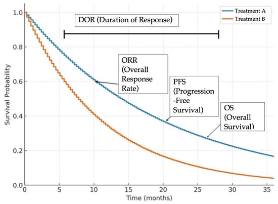 Representative Kaplan–Meier survival curves illustrating common clinical trial endpoints in oncology. Overall survival (OS) is the time from treatment initiation until death from any cause. Progression free survival (PFS) is the time from treatment initiation until disease progression or death. Overall response rate (ORR) is the proportion of patients achieving a predefined amount of tumor shrinkage according to RECIST criteria, regardless of duration. Duration of response (DOR) is the time from initial tumor response to disease progression or death. These curves are for illustrative purposes only and do not represent actual patient data.