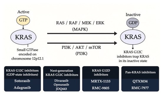 KRAS, a small GTPase encoded on chromosome 12p12.1, plays a pivotal role in transmitting intracellular signals. In its active, GTP-bound form, KRAS initiates downstream signaling via the RAS/RAF/MEK/ERK (MAPK), PI3K/AKT/mTOR, and RalGDS/Ral pathways, ultimately promoting cell growth, survival, and metastasis [85,113,114]. Activation is triggered when extracellular signals engage receptor tyrosine kinases such as EGFR, ALK, MET, HER2, RET, FGFR, and NTRK, leading to recruitment of adaptor proteins like growth factor receptor-bound protein 2 (GRB2) and guanine nucleotide exchange factors (GEFs) such as Son of Sevenless homolog 1 (SOS1) [115]. GEFs catalyze GDP release from KRAS, enabling cytosolic GTP binding and switching KRAS to its “ON” state. Scaffolding protein SHP2 (Src homology region 2-containing protein tyrosine phosphatase 2) (PTPN11) stabilizes RTK-GRB2-SOS1 signaling, facilitating GDP to GTP state switching [116]. Signal termination requires intrinsic KRAS GTPase activity, strongly accelerated by GTPase-activating proteins (GAPs) such as NF1 and RASA1, which hydrolyze GTP back to GDP, returning KRAS to the inactive state [117].