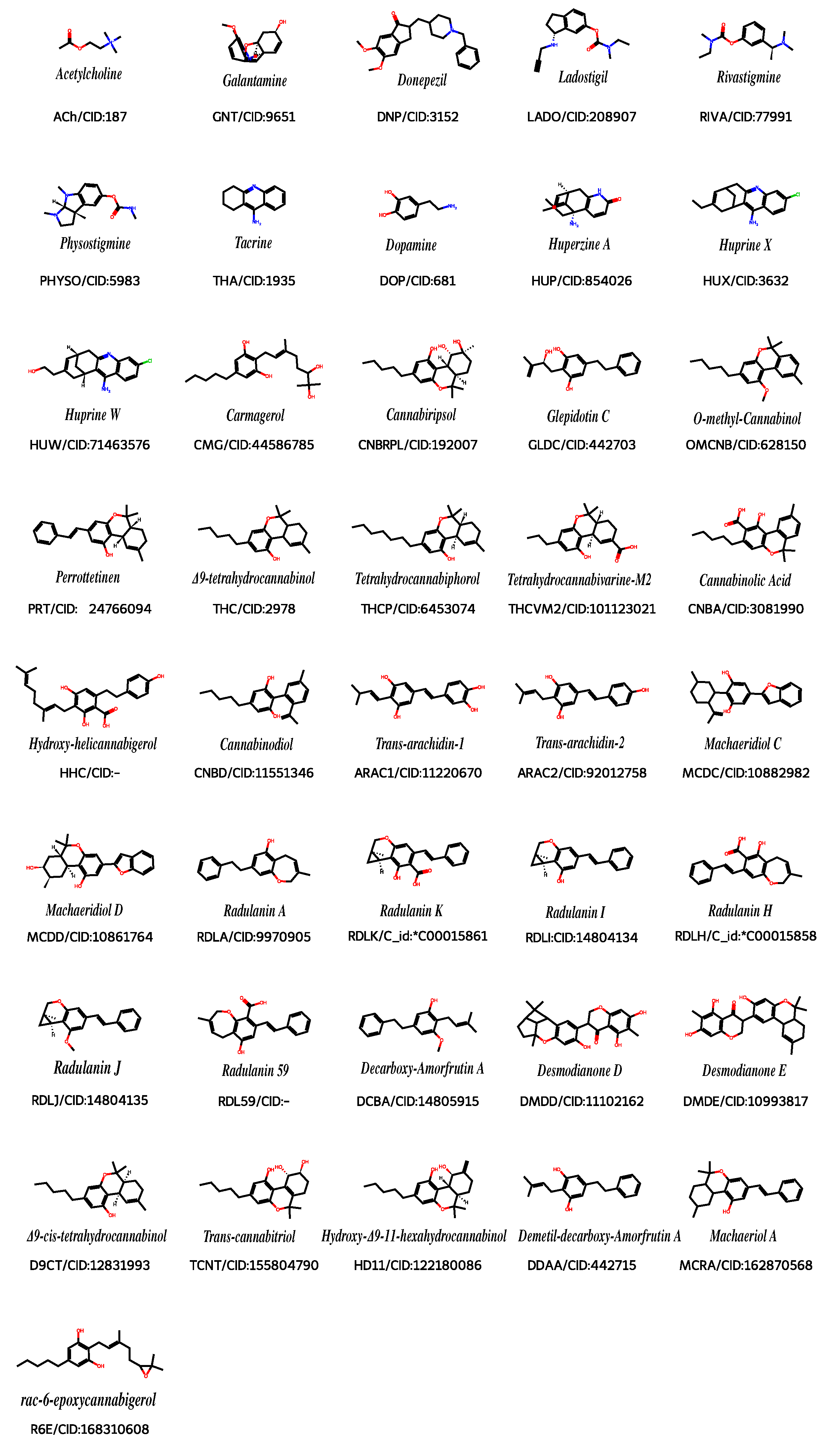 - Vasquez, R.; Batista, L.; Cuya, T. Computational Study on the Enzyme–Ligand Relationship between Cannabis Phytochemicals and Human Acetylcholinesterase: Implications in Alzheimer’s Disease. J. Phys. Chem. B 2023, 127, 8780–8795. [Google Scholar] [CrossRef]