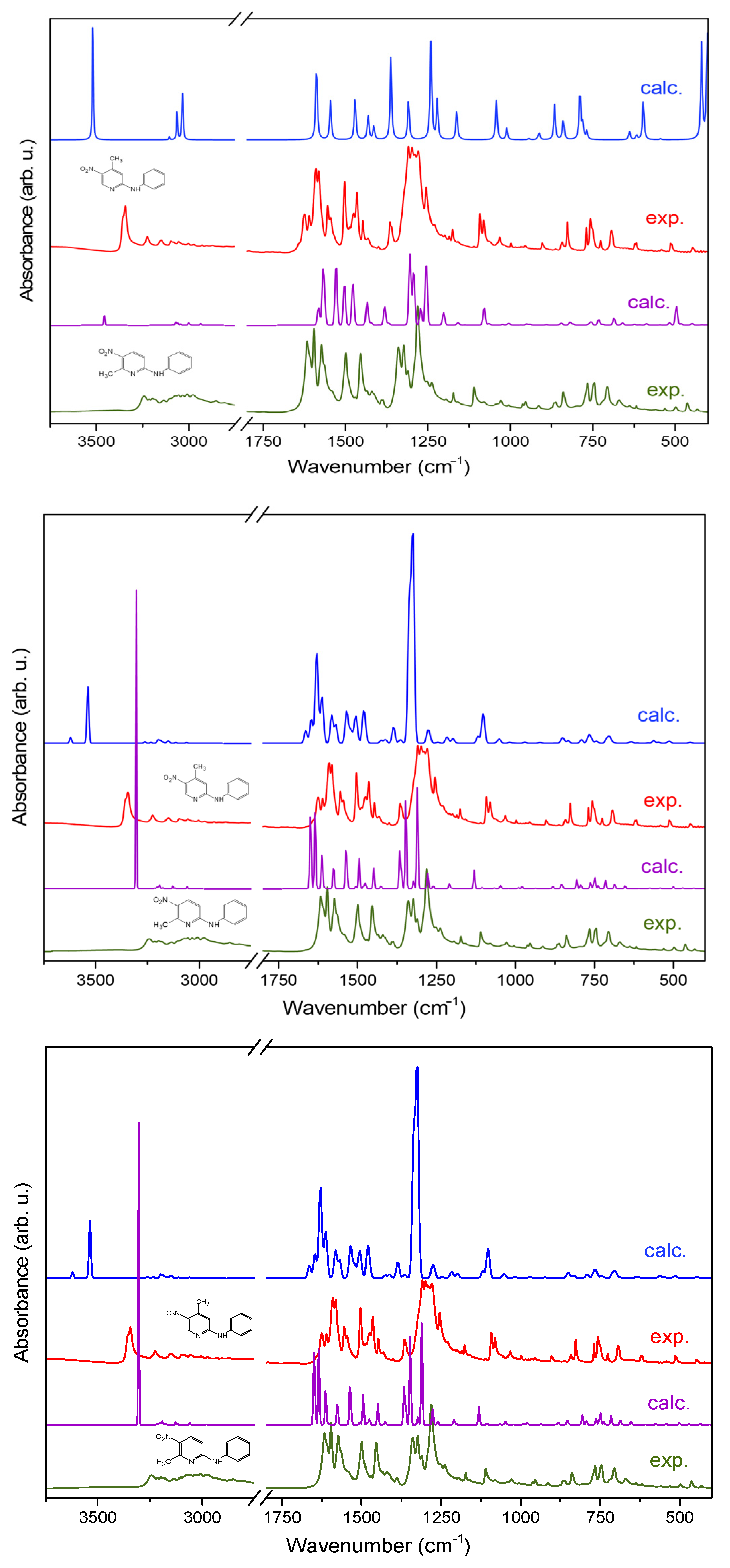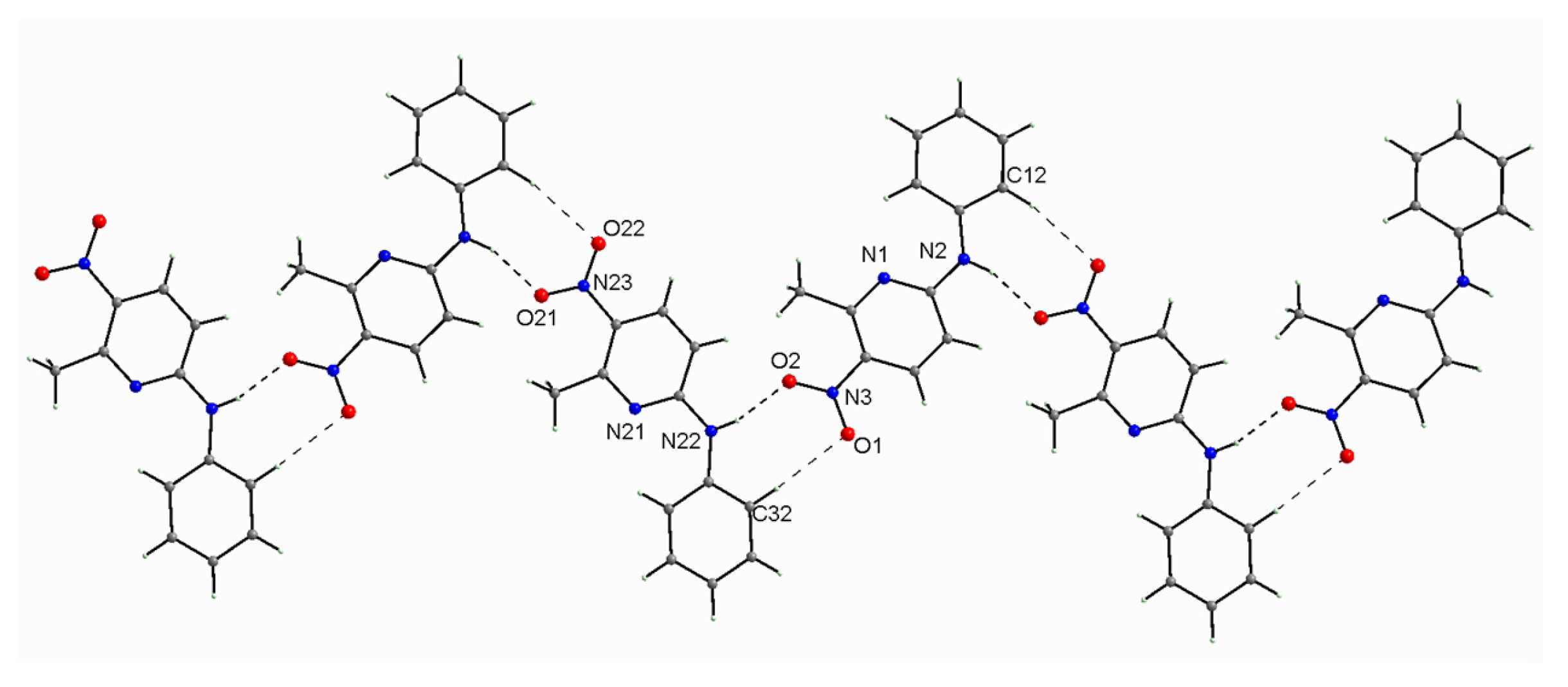 - Michalski, J.; Kucharska, E.; Sąsiadek, W.; Lorenc, J.; Hanuza, J. Intra- and Inter-molecular Hydrogen Bonds, Conformation and Vibrational Characteristics of Hydrazo-group in 5-nitro-2-(2-phenylhydrazinyl)Pyridine and Its 3-, 4- or 6-methyl Isomers. Spectrochim. Acta Part A Mol. Biomol. Spectrosc. 2013, 112, 263–275. [Google Scholar] [CrossRef] [PubMed]
