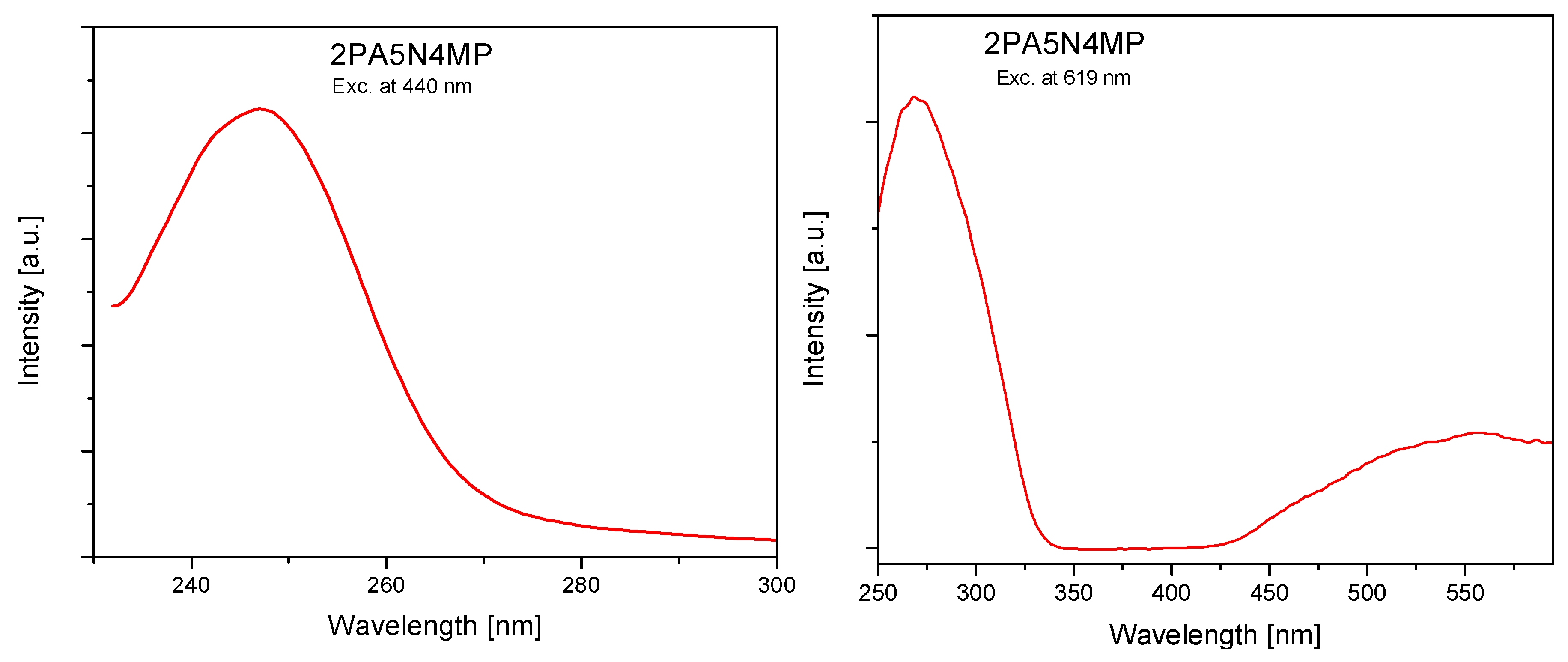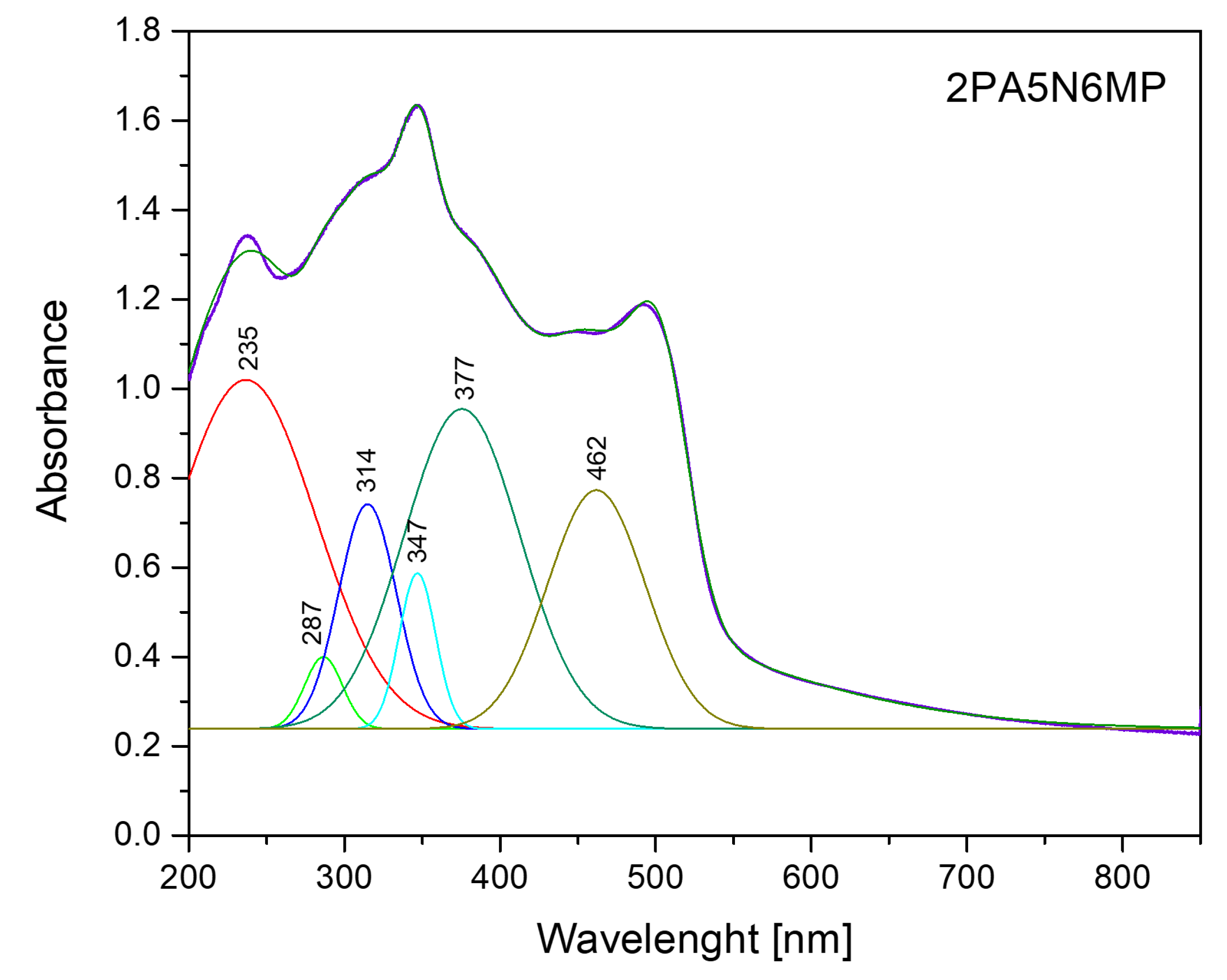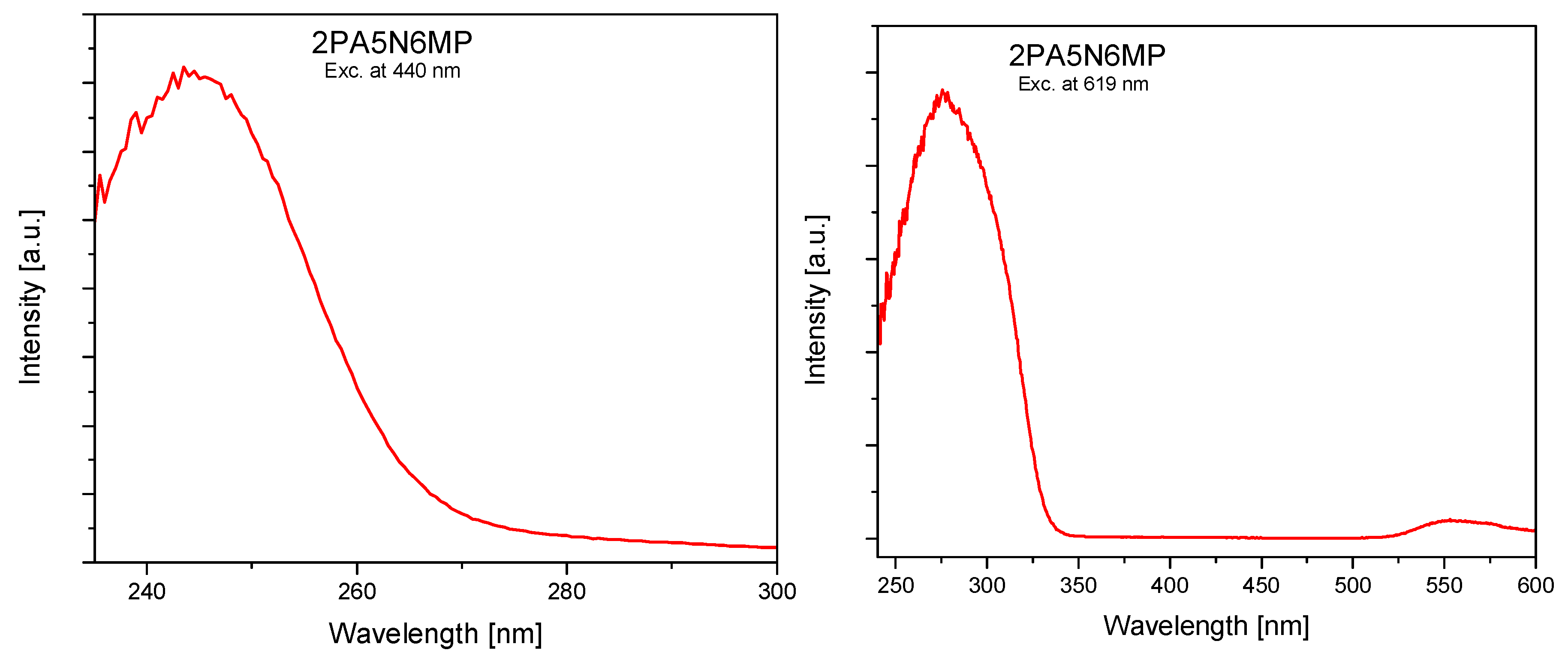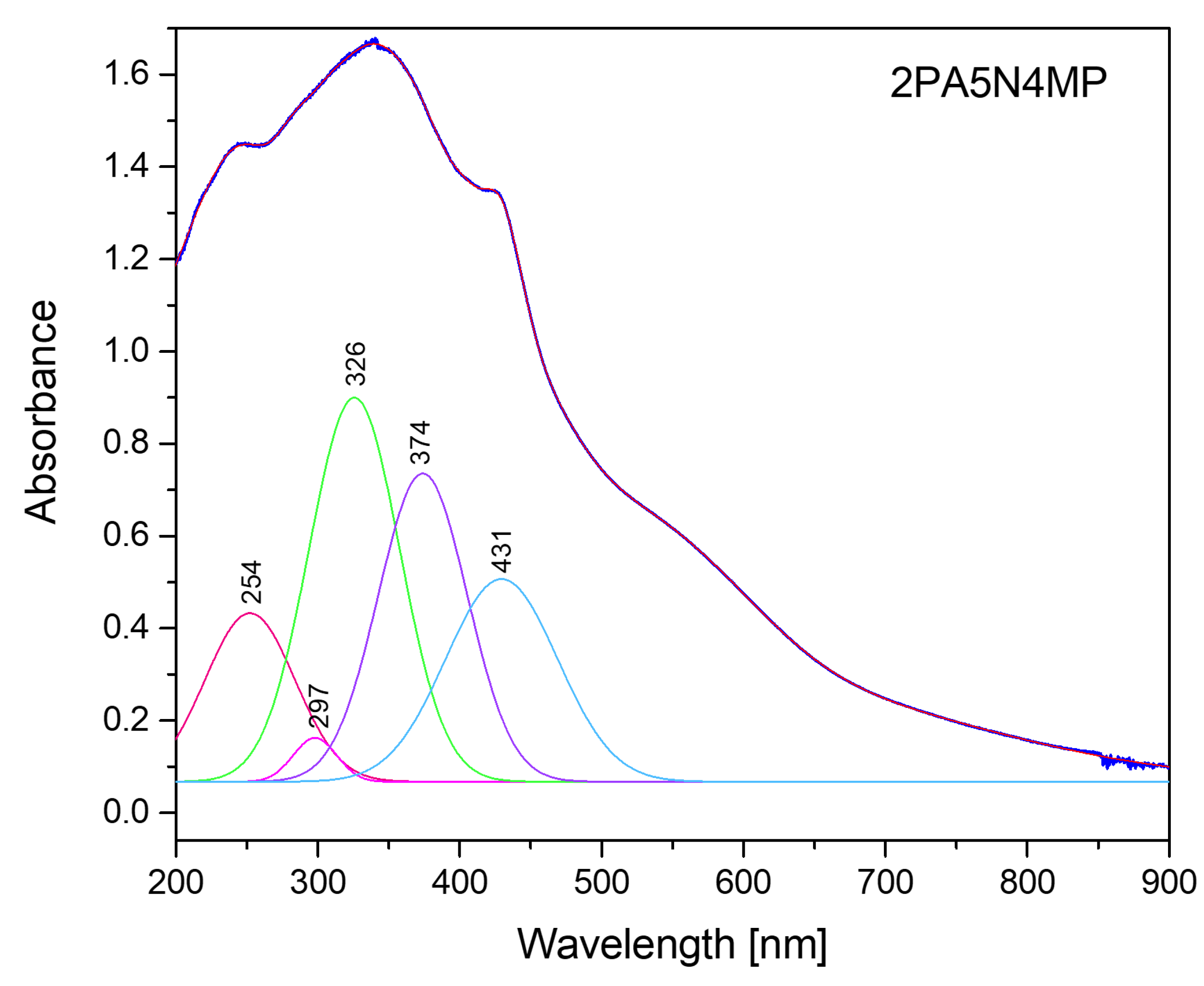 - Bryndal, I.; Kucharska, E.; Wandas, M.; Lorenc, J.; Hermanowicz, K.; Mączka, M.; Bryndal, I.; Kucharska, E.; Wandas, M.; Lorenc, J.; et al. Optical properties of new hybrid materials based on 2-amino-4-methyl-3-nitropyridine derivatives. Spectrochim. Acta A Mol. Biomol. Spectrosc. 2014, 117, 434–441. [Google Scholar] [CrossRef] [PubMed]