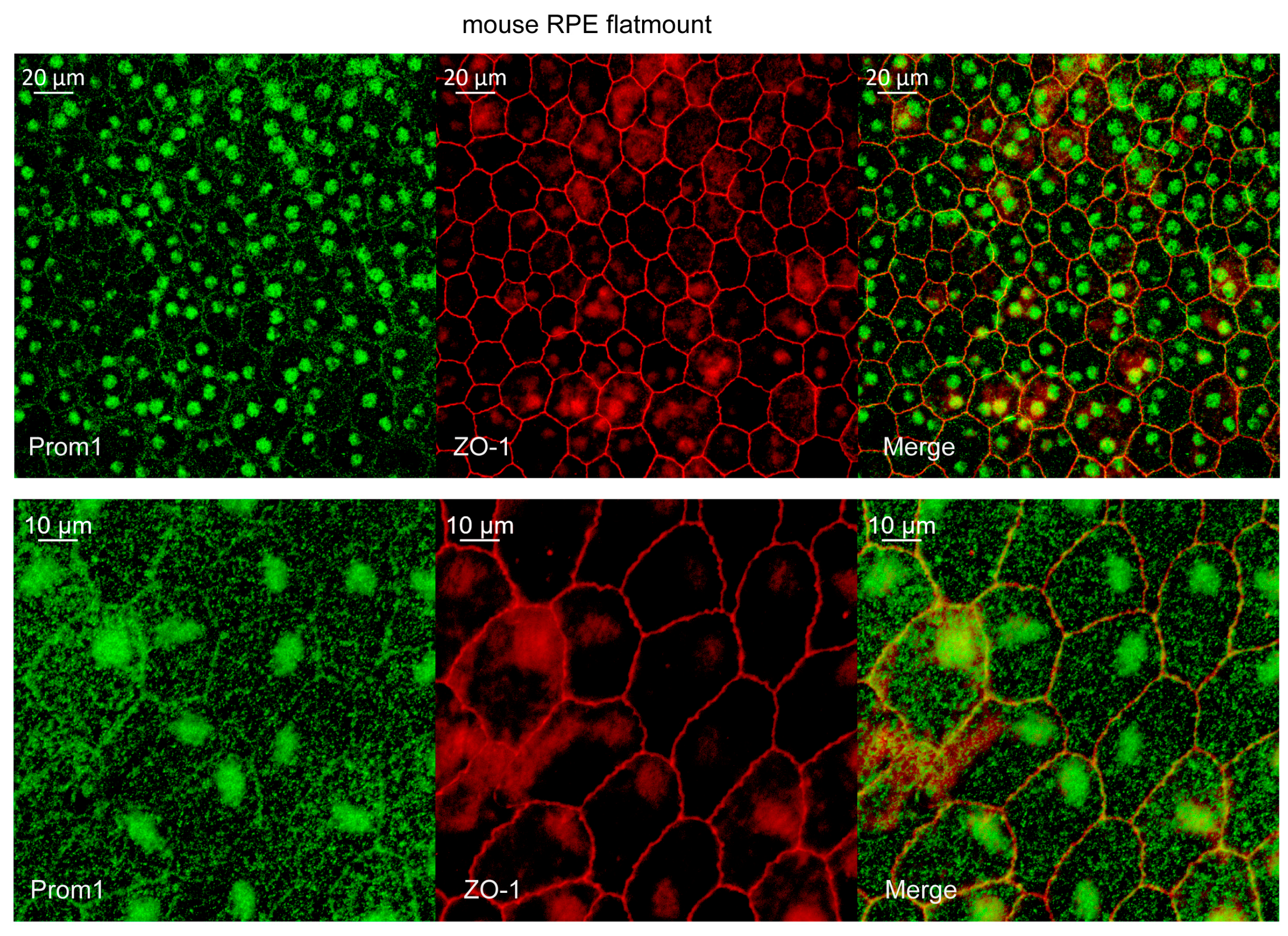 Figure 1. Prom1 is expressed in both mRPE in situ. Immunohistochemistry of WT mouse RPE flatmounts with Prom1 (green) and ZO-1 (red) antibodies. Confocal images with 40× objective and 40× zoom.