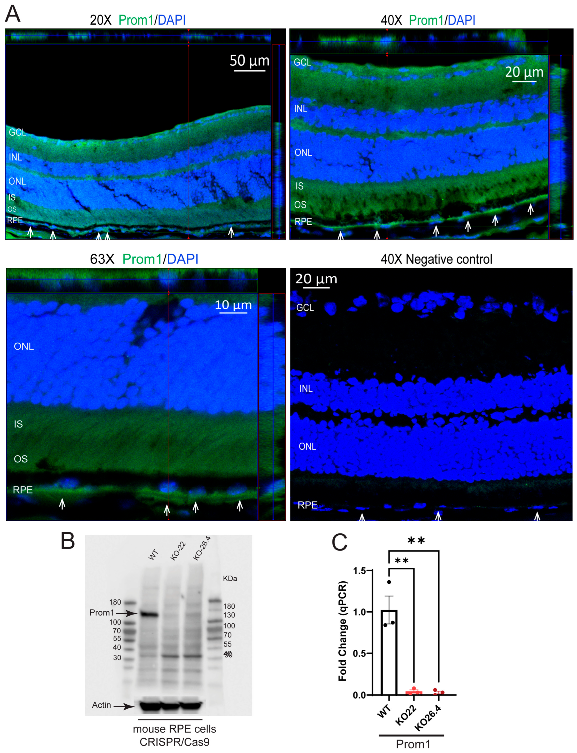 Figure 2. Prom1 expression in mouse retina sections and mouse RPE cells. (A) WT mouse retina sections were stained for Prom1 (green) and DAPI (blue) at 20×, 40×, and 63× objectives with 3D orthogonal views (white arrowheads showing Prom1 expression in RPE), and no Prom1 labeling in the negative control at 40×. (B) Western blot analysis showing Prom1 protein levels in WT and Prom1-KO (KO-22 and KO-26.4) cells. (C) Relative Prom1 gene expression in WT, Prom1-KO22, and KO26.4 cells. WT compared to KO-22 (** p < 0.01) and WT compared to KO-26.4 (** p < 0.01).