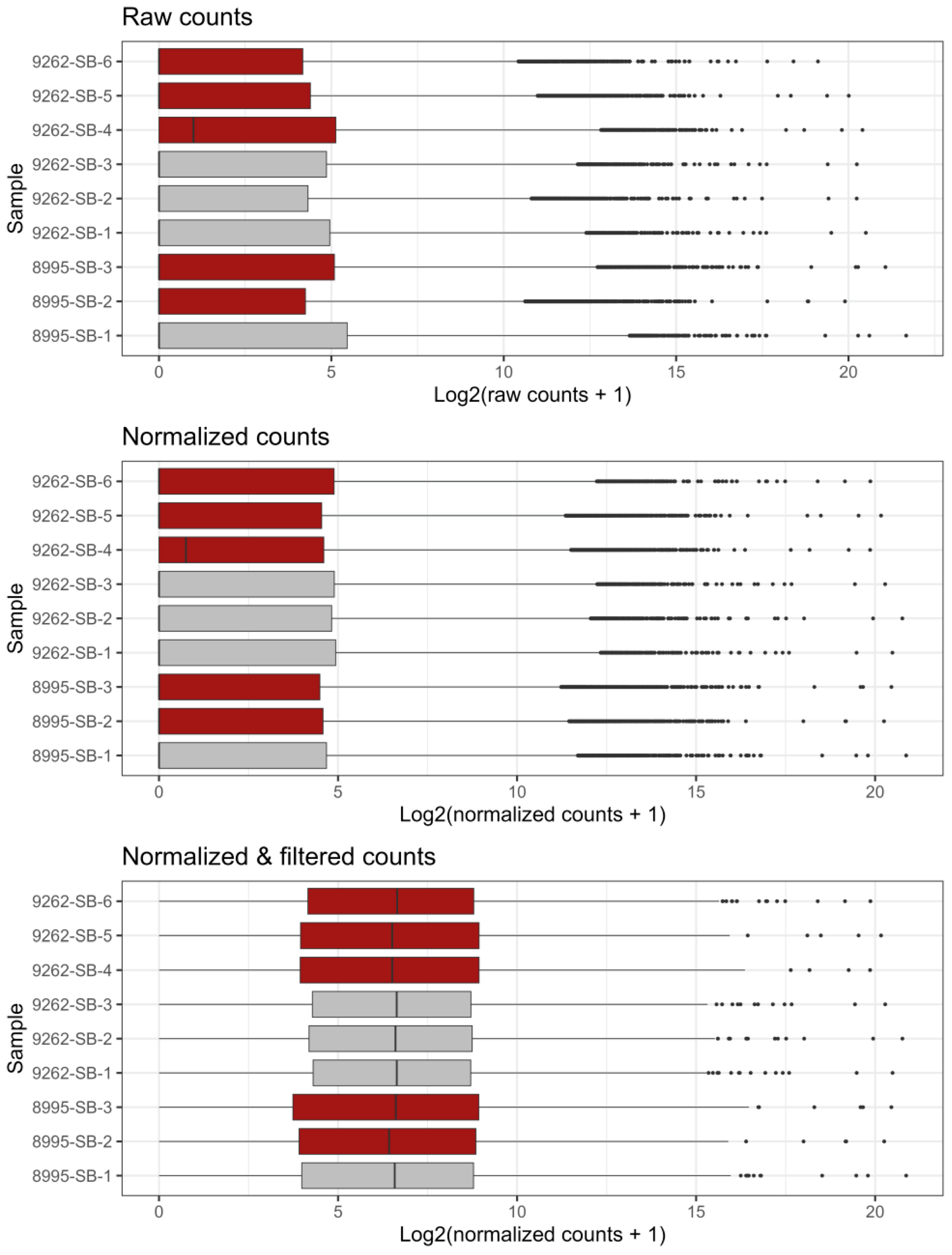 Figure 3. RNA sequencing counts, normalized and filtered. The number of raw sequencing counts before normalization, post-normalization, and post-filtering on a Log2 + 1 scale to visualize features with 0 counts. Counts for each gene were normalized to the sequencing depth for each sample. Genes were filtered out if they were counted fewer than 5 times across at least three samples. WT samples are in grey (9262-SB-1, -2, -3, and 8995-SB-1), and Prom1-KO samples (9262-SB-4, -5, -6, and 8995-SB-1, -2) are in red.