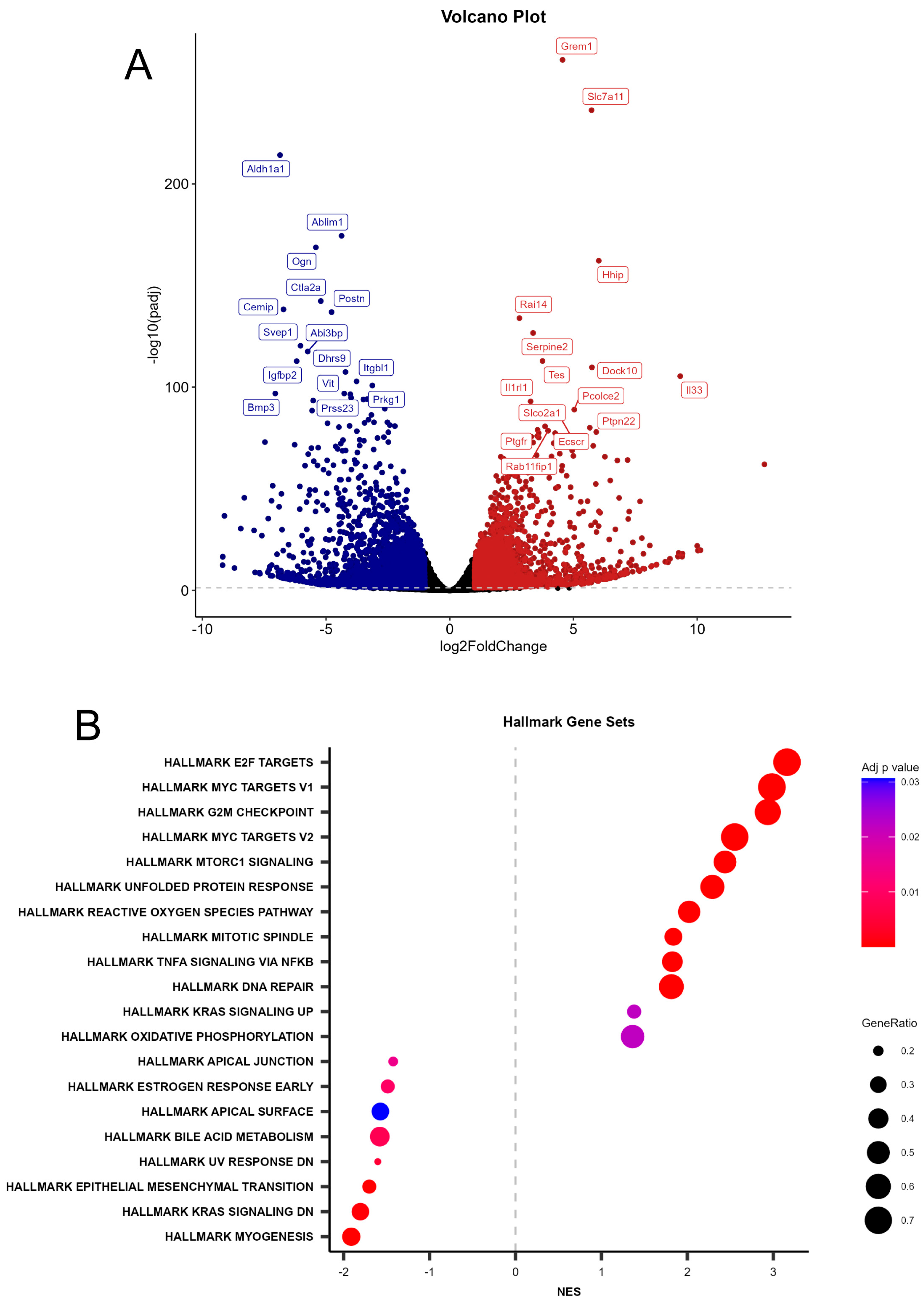 Figure 4. Differential expression of genes and gene enrichment analysis in WT vs. Prom1-KO mRPE cells. (A) Volcano plot illustrating the top 15 differentially expressed genes (DEGs) in Prom1-KO vs. WT mRPE cells by bulk RNA sequencing. Significantly upregulated (in red) and downregulated (in blue) are labeled; n = 3/group. Selected notable genes are labeled for reference. (B) The normalized gene enrichment score (NES) of Hallmark gene sets from the Molecular Signature Database reveals up- and downregulated pathways in Prom1-KO vs. WT mRPE cells (n = 3/group). Dot size corresponds to the number of genes in each set, while color reflects adjusted p-value with a gradient from blue (less significant) to red (highly significant).