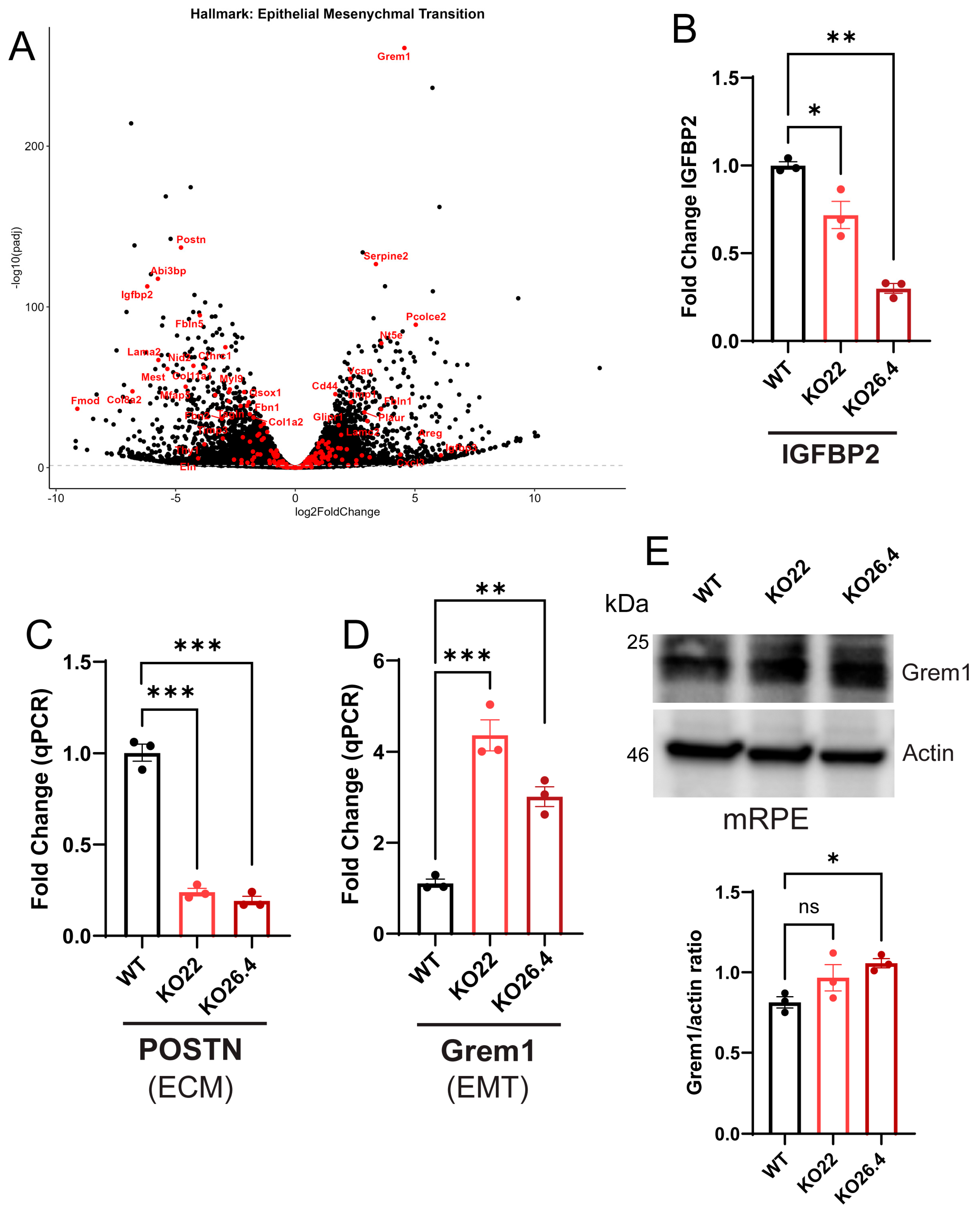 Figure 7. Prom1 deficiency induces EMT-associated gene expression in mRPE cells. (A) Volcano plot of RNA-seq data highlighting differentially expressed genes associated with the hallmark EMT pathway. Genes with significant upregulation include Grem1, Serpine 2, and Pcolce2. Downregulated genes are Postn, Abi3bp, and Igfbp2. (B) Validation of IGFBP2 gene expression by qPCR in KO22 and KO26.4 compared to WT (* p < 0.05, ** p < 0.01). (C) POSTN gene expression in KO lines relative to WT (*** p < 0.001). (D) Grem1 gene expression in KO22 and KO26.4 compared to WT (** p < 0.01, *** p < 0.001). (E) Western blot analysis showing Grem1 protein levels in WT and Prom1-KO RPE cells, with Actin used as a loading control. Quantification of Grem1 and actin ratio (ns = not significant, * p < 0.05).