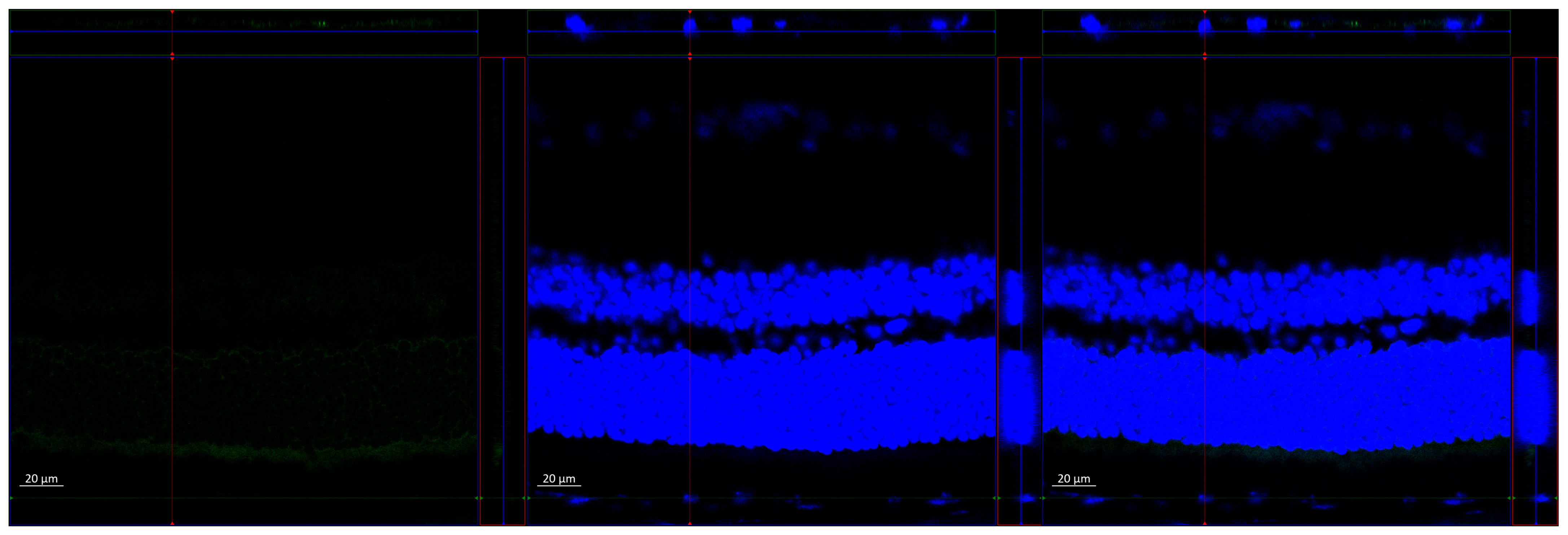 The enucleated mouse eyes were immersed in 4% PFA overnight at 4 °C and rinsed 3 times in PBS. The eyes were immersed in 10% sucrose in PBS for 2–4 h, transferred to 20% sucrose, and finally to 30% sucrose overnight at 4 °C. The eyes were embedded in cryomold, sectioned at 10 μm with a cryostat, mounted on slides, and stored at −80 °C. The cryo slides were taken out of the freezer, warmed for 10 min at room temperature, washed twice in PBS with 0.5% Triton X-100 for 15 min, blocked for 2 h at room temperature in 1× PBST with 5% normal donkey serum, incubated with primary antibody overnight in 1× PBS, followed by three washes in 1× PBS for 10 min, and incubated with secondary antibody in 1× PBST with 5% NDS for 1 h at room temperature. Slides were washed in 0.5% TritonX-100 in PBS and coverslipped with Fluoromount-G with DAPI. No primary antibody was used for the negative control slide; however, the slides were incubated with secondary antibody and coverslipped with Fluoromount-G containing DAPI, as described above. Confocal images of retina sections and RPE flatmount samples were captured using a Zeiss LSM880 confocal microscope with Zeiss ZEN (black) 2.3 software, applying the following parameters: For retina section images at 20× magnification: Plan-Apochromat 20×/0.8 objective; 405 nm excitation at 1.5% and 488 nm excitation at 1.0%; detection wavelengths from 410 to 495 nm and 495–630 nm; gain set to 800; offset at 0; pixel dwell time of 1.02 microseconds per pixel; averaged twice; Z-stack of 12 slices covering approximately 25 microns at Nyquist sampling; scale = 0.42 × 0.42 × 0.29 microns per pixel. For retina section images at 40×: Plan-Apochromat 40×/1.3 Oil DIC UV-IR objective; 405 nm excitation at 1.5% and 488 nm excitation at 1.5%; detection wavelengths from 410 to 495 nm and 495–630 nm; gain = 800; offset = 0; pixel dwell time of 1.02 microseconds per pixel; averaged twice; Z-stack of 18 slices over approximately 18 microns at Nyquist sampling; scale = 0.21 × 0.21 × 1.07 microns per pixel. For retina section images at 63×: Plan-Apochromat 63×/1.4 Oil DIC objective; 405 nm excitation at 2.2% and 488 nm excitation at 2.4%; detection wavelengths from 410 to 495 nm and 495–630 nm; gain = 800; offset = 0; pixel dwell time of 1.02 microseconds per pixel; averaged twice; Z-stack of 25 slices over approximately 12 microns at Nyquist sampling; scale = 0.13 × 0.13 × 0.53 microns per pixel. For RPE flatmount images at 40×: Plan-Apochromat 40×/1.3 Oil DIC UV-IR objective; 488 nm excitation at 0.7% and 633 nm excitation at 6.5%; detection wavelengths from 493 to 628 nm and 638–755 nm; gain = 800; offset = 0; pixel dwell time of 2.05 microseconds per pixel; averaged twice; Z-stack of 11 slices over roughly 8 microns at Nyquist sampling; scale = 0.21 × 0.21 × 0.82 microns per pixel. Maximum Intensity Projections and orthogonal projections were generated using Zeiss ZEN (blue) 3.8.