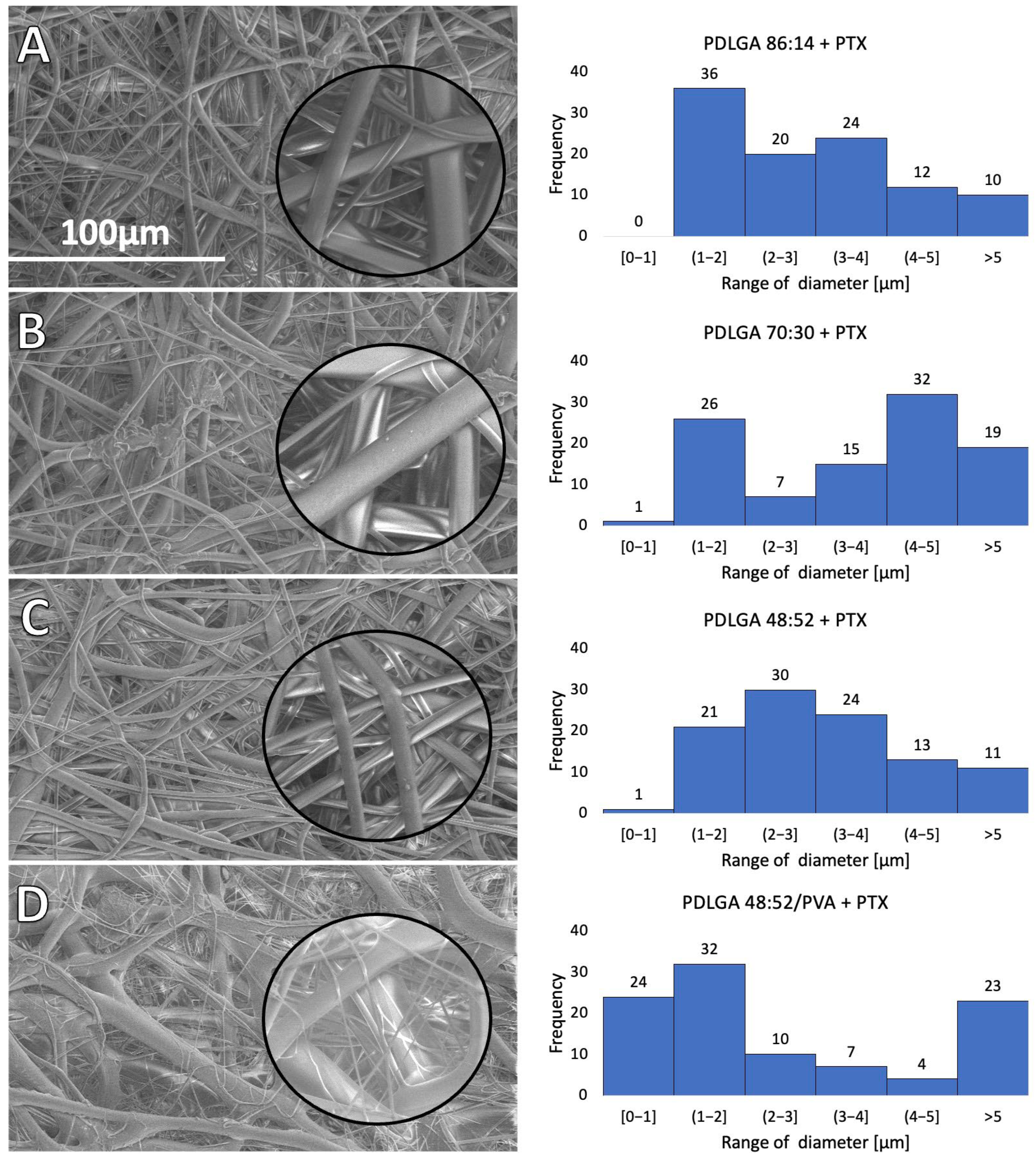 Four types of PTX-loaded nonwovens were produced by the electrospinning method as follows: composed of PDLGA 86:14, PDLGA 70:30, PDLGA 48:52, or a mixture of PDLGA 48:52 with PVA. PDLGA nonwoven was made from a solution of a copolymer in a mixture of solvents (15% w/w for solution of PDLGA 86:14 and PDLGA 70:30, 20% w/w for solution of PDLGA 48:52). The solvent mixture was composed of chloroform and HFIP in a volume ratio of 4:1. The PDLGA/PVA nonwoven was obtained by using only HFIP as a solvent (16% w/w) with a PDLGA and PVA mass ratio of 9:1. In the first step, PVA was dissolved in HFIP at 48 °C and stirred on a magnetic stirrer at 350 rpm. PDLGA was added after complete dissolution of PVA and the PDLGA/PVA mixture was left on a magnetic stirrer at 350 rpm overnight.