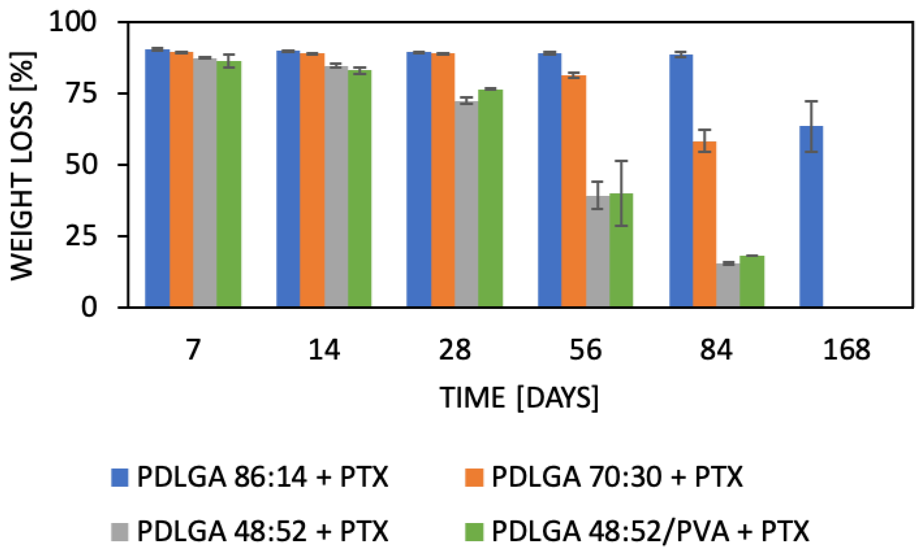 Table 1), the lower weight of 5 mm discs used in the study resulted in almost half the PTX dose in PDLGA 48:52/PVA + PTX (257.4 µg vs. 404.1 µg).
