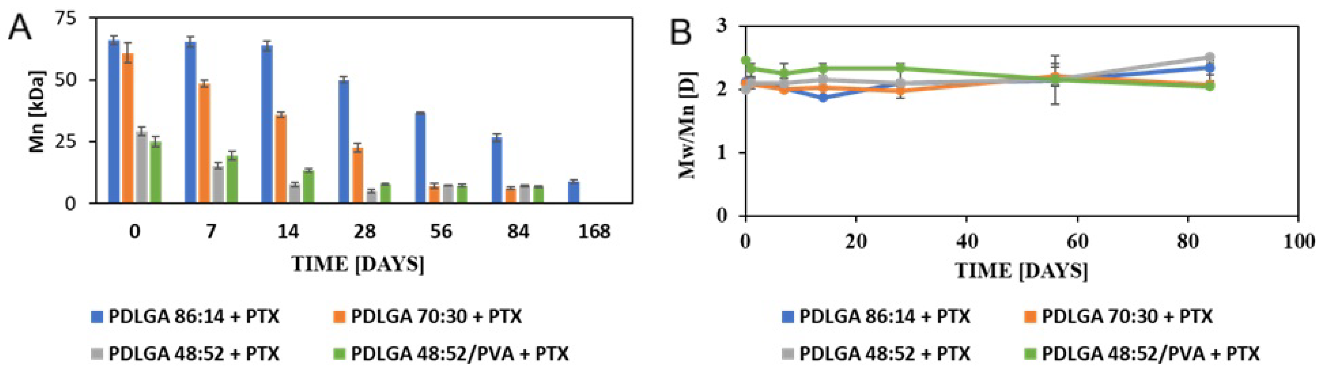 46]. In fact, the degradation of the nonwoven depended on its polymeric composition and molar mass. According to our expectations, the PDLGA 86:14 + PTX demonstrated the highest content of lactidyl units, and its molar mass presented the highest stability during incubation. However, the slow degradation process resulted in very limited PTX release (