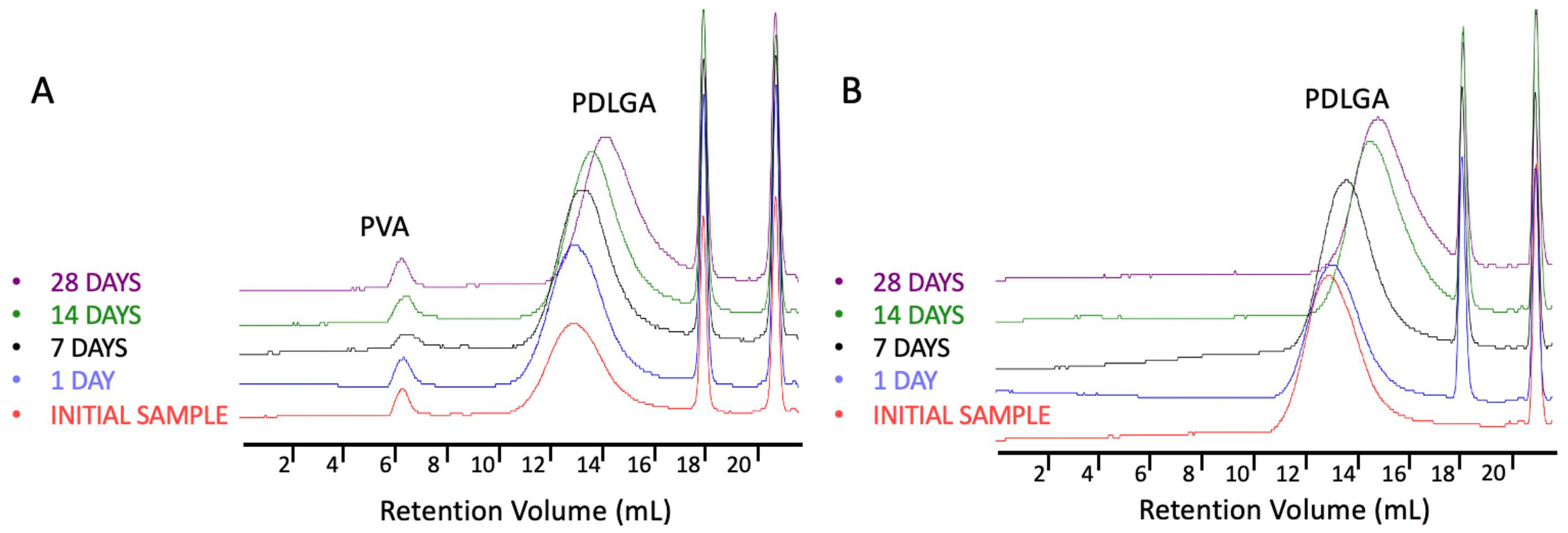 Figure 10B). The composition of PDLGA affects the rate of degradation and, therefore, the kinetics of drug release. Generally, the degradation of poly(D,L-lactide-co-glycolide) accelerates with the increase in glycolidyl unit content [