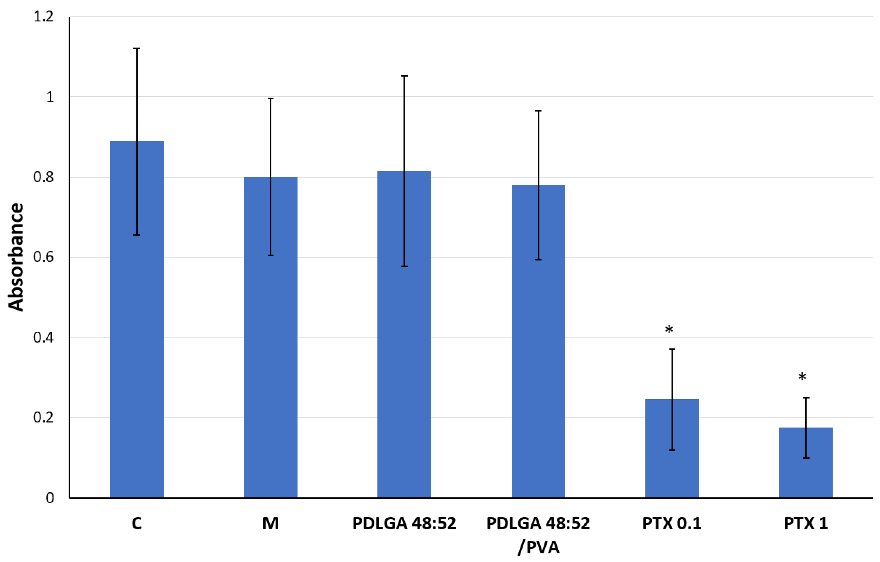 The in vitro experiments were conducted to analyze the cytotoxic effect of PTX released from PDLGA 48:52 + PTX and PDLGA 48:52/PVA + PTX nonwovens against the 4T1 murine mammary carcinoma cell line (
