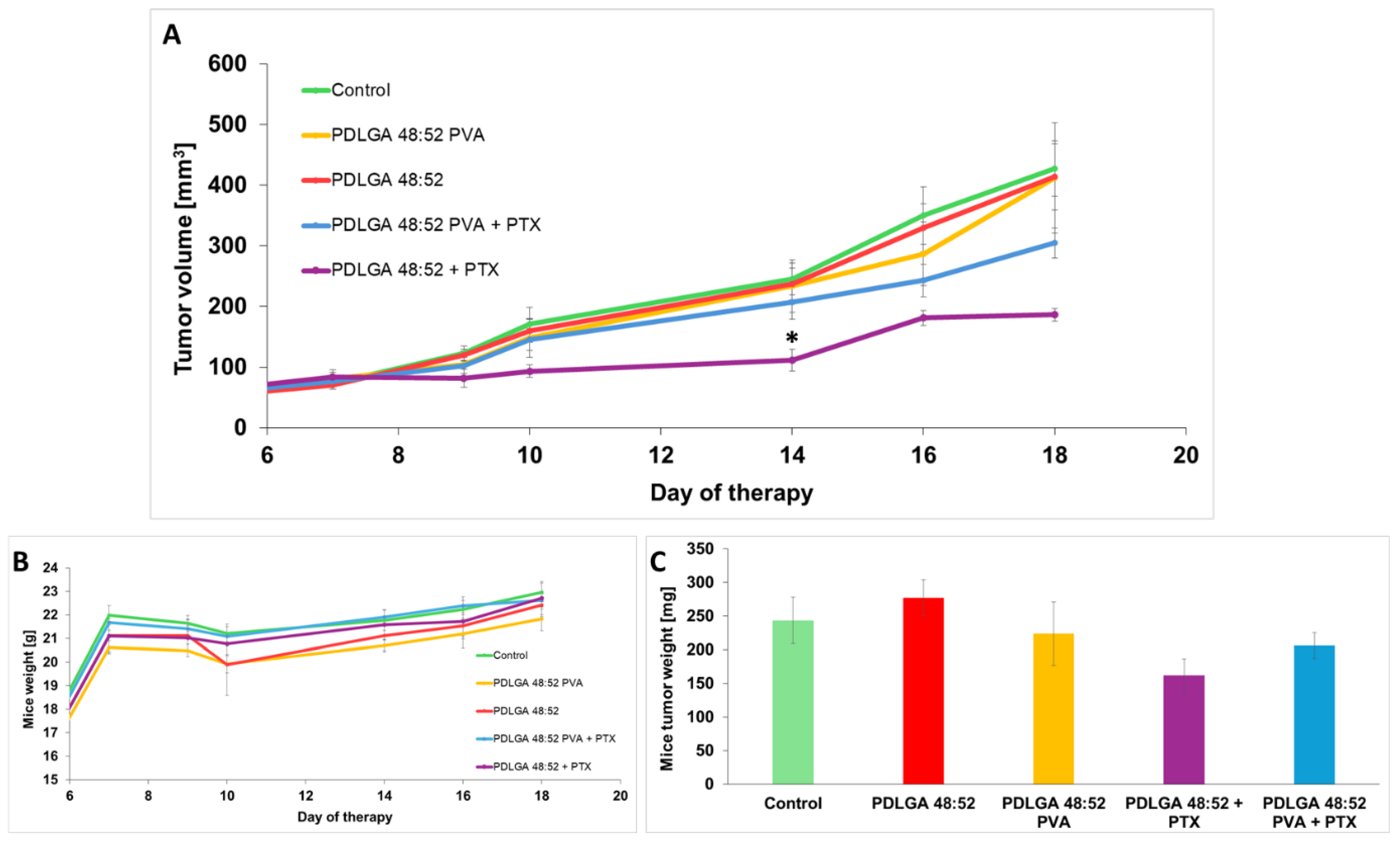 In vivo studies confirm the effectiveness of the constructed nonwovens, especially PDLGA 48:52 + PTX. These results are consistent with other published data on PTX releasing ES nonwovens designed for local therapy. The efficacy of PTX delivered in ES nanofibers obtained from poly(D,L-lactide-co-glycolide) (PDLGA) 50:50 against triple-negative breast cancer progression was confirmed in a mouse model [