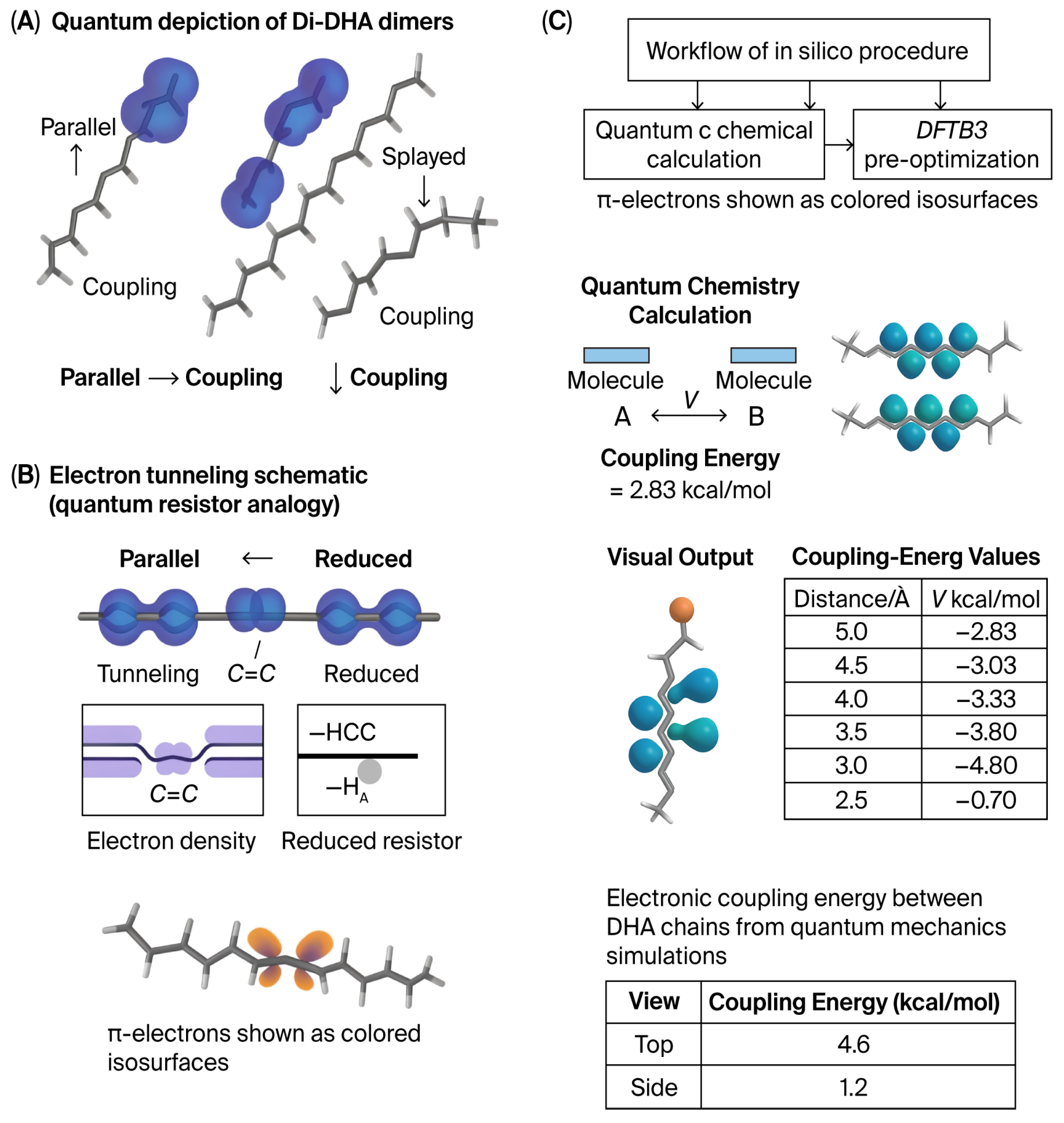 Recent insights into membrane biophysics and quantum biology now provide a lens for reconsideration. Building on our earlier work regarding DHA’s structure, its extreme conservation in electrical signaling membranes of the brain, and its role in visual transduction, we advance here an explanation of why DHA’s polyunsaturated structure permits electron tunneling, exciton migration, and resonance energy transfer within the lipid bilayer. These quantum phenomena may be amplified in the densely packed and highly ordered environment of synaptic membranes. Rather than acting as passive scaffolds, DHA-rich domains can be viewed as active participants in information processing.