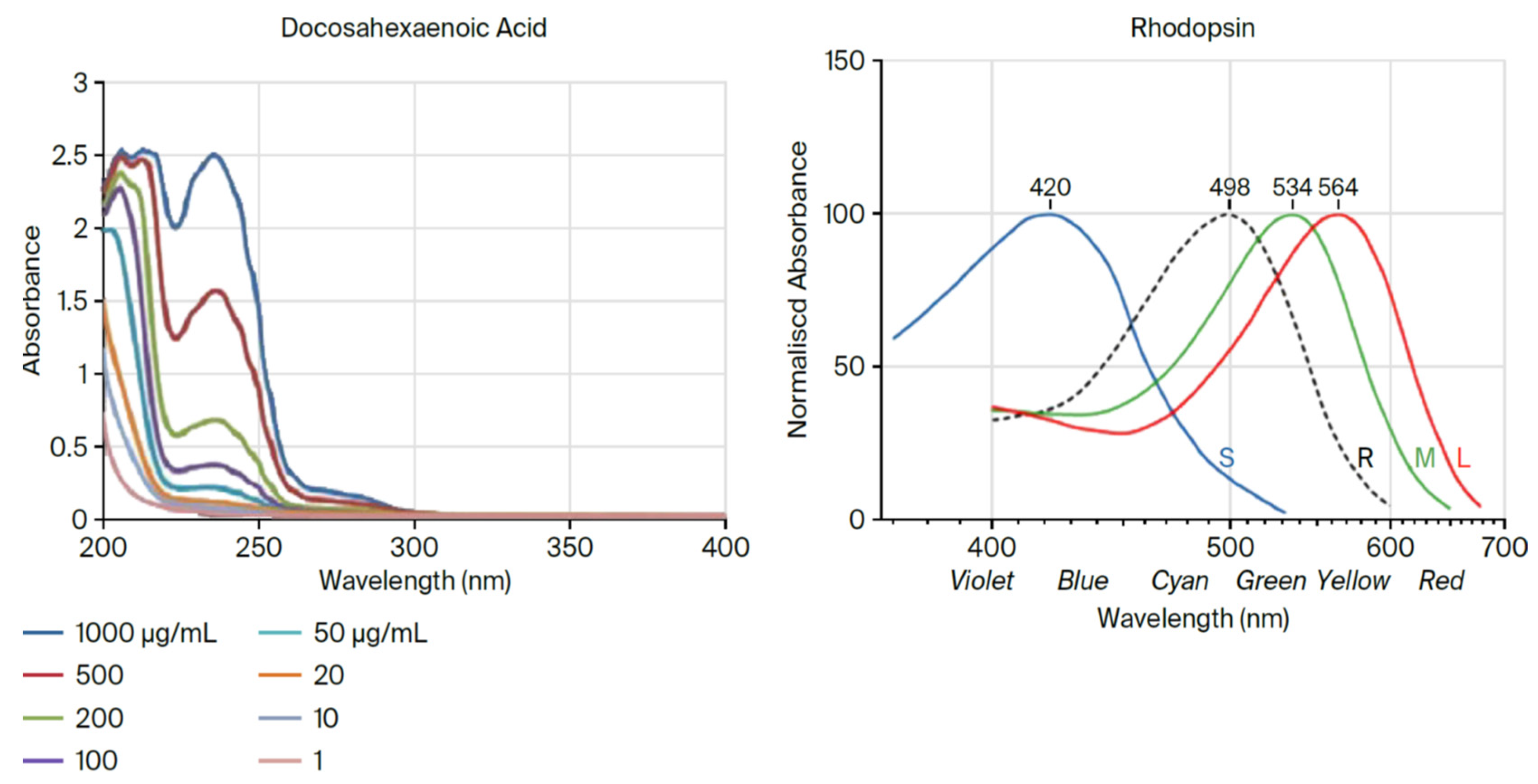 In retinal molecules, the double bonds in the side chain are in the TRANS configuration; except for the 11-cis, the photon acceptor is conjugated, which means the electrons are free to move along the molecule. DHA’s unique six methylene-interrupted double bond geometry resembling chromophores in photoreceptive proteins, however, are in the CIS configuration, which is at a higher energy state than TRANS, and the -CH2- between the double bonds restricts the movement of the π-electrons to their respective wells.