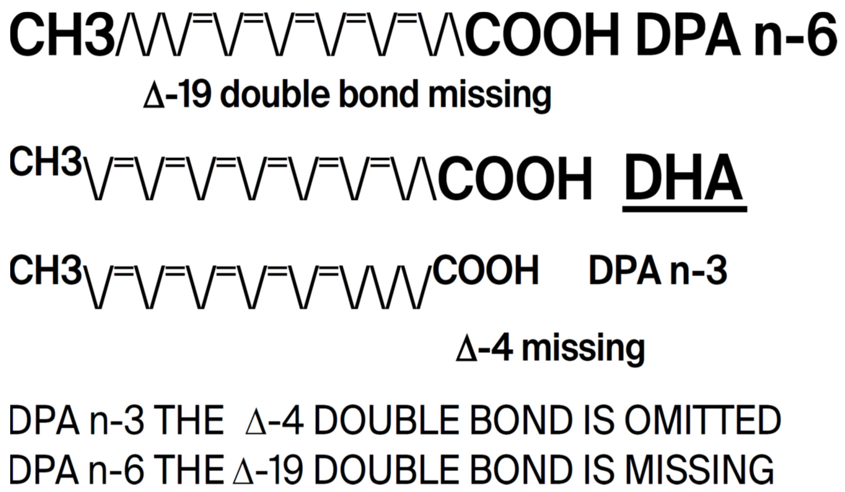 10]. But despite being easier to synthesize, less susceptible to peroxidation in an oxygen-fueled locality, and more readily available especially in large herbivorous mammals, DPA never replaced DHA. Rather, DHA has served the construction of visual cell membranes, neurons, and synapses throughout the evolution of multicellular systems, and starting with the dinoflagellates, its presence is found in high proportion in the photoreceptors and neural membranes of its descendants including orthoceras, cephalopods, fish, amphibia, reptiles, birds, mammals, and primates. The principal difference between DHA and DPA is that DPA has only one double bond, and as evidence of its criticality, DHA has two. (see