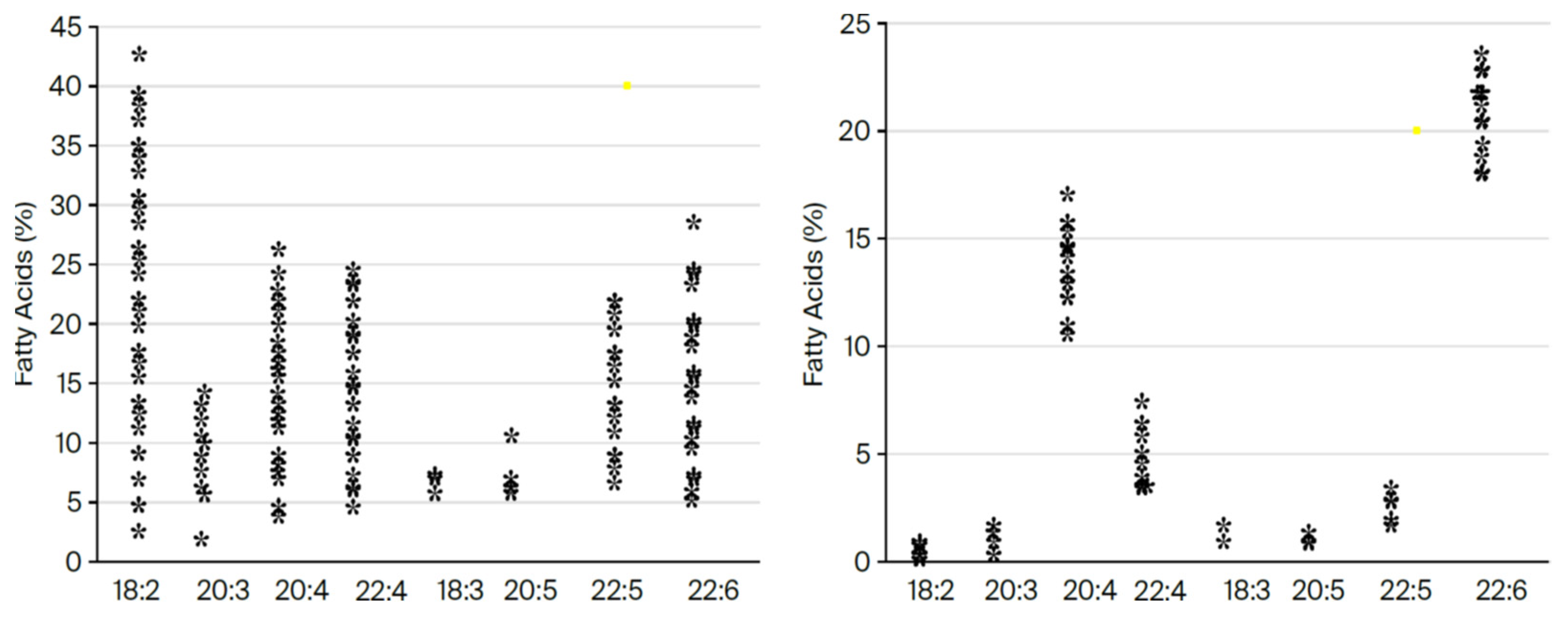 Variation in EPG fatty acids in liver and brain in 36 mammalian species. (Constructed by MAC using Word.) Shown here are the variation in the fatty acid composition of the ethanolamine phosphoglycerides from the liver (plotted on the