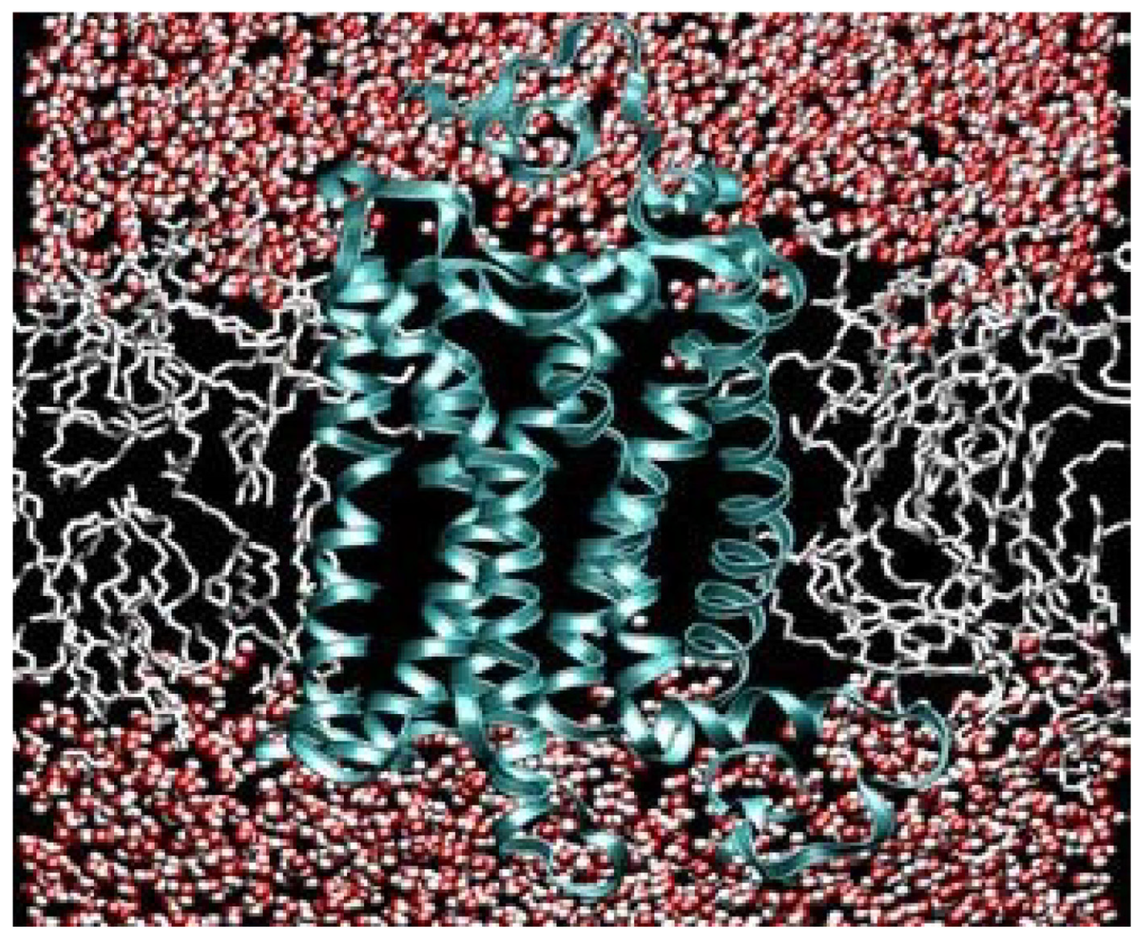 Illustration of a lipid bilayer with a transmembrane protein (with thanks to Klaus Gawrisch, National Institutes of Health). The red and white dots are water molecules, each with its own dipole: red for hydrogen and white for the negativity of the oxygen.