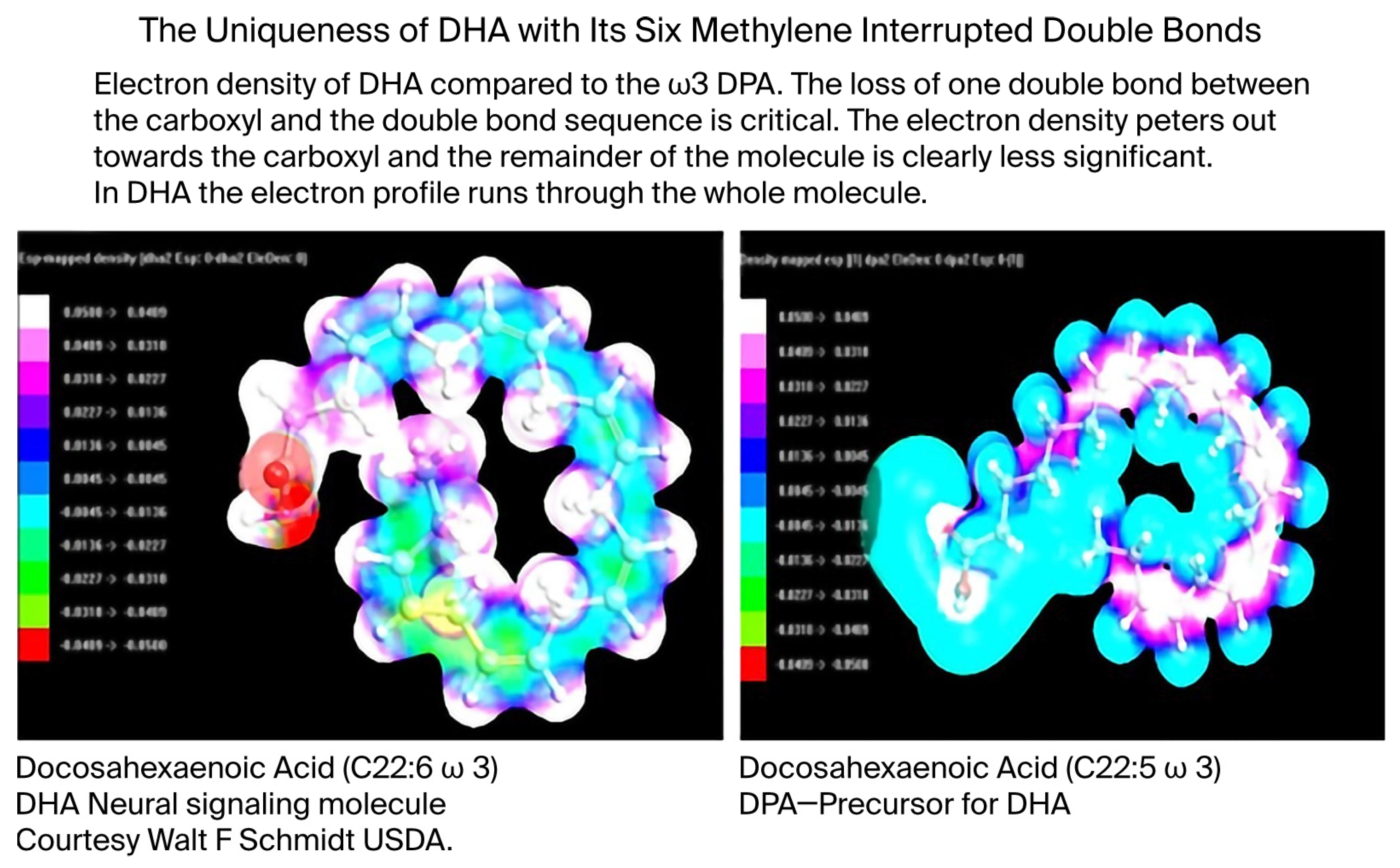 The uniqueness of DHA (calculated and visualized by commercial computational chemistry, HyperChem 8.0.10 for Windows. Molecular Modeling System Updated 2011, Hypercube, Inc. Gainesville, FL 32601 USA). Comparison of the electron density of DHA and its n-3 DPA precursor with one less double bond is shown here. The scale is normalized differential electronegativity. The result shown illustrates electron density across the whole of DHA, which is not the case with DPA.
