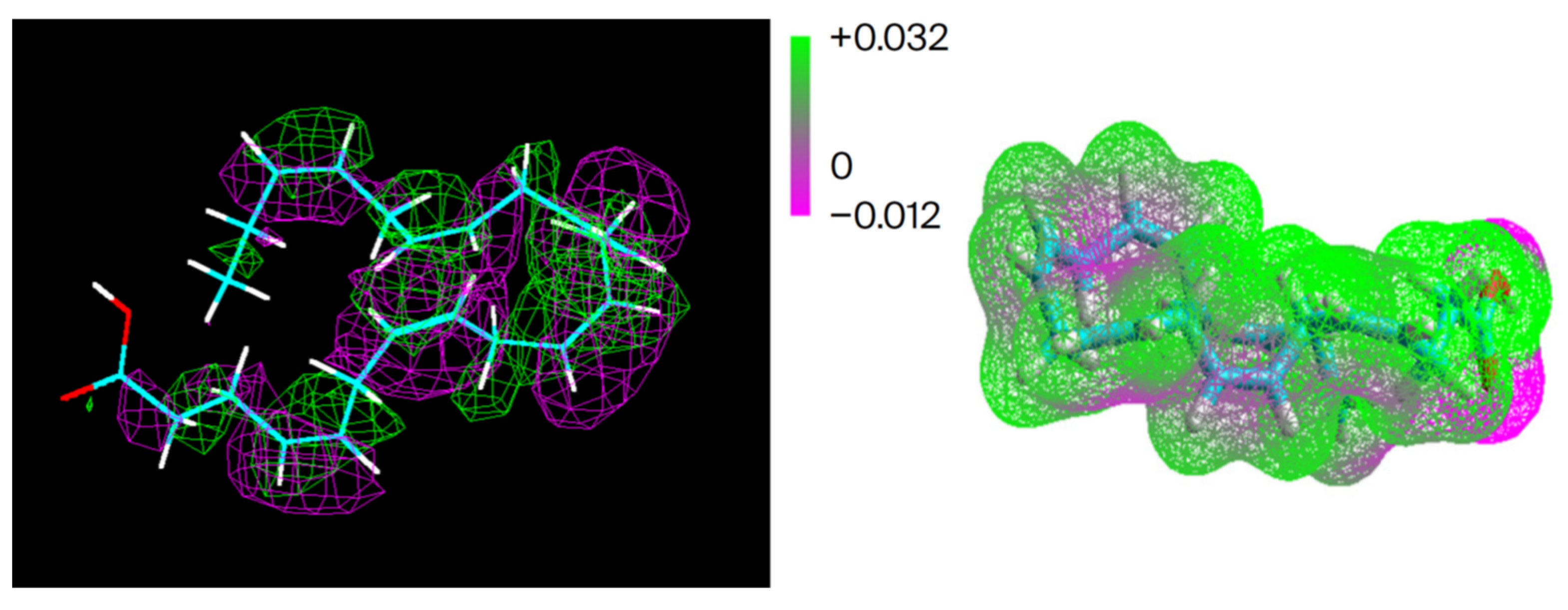 DHA’s electron and spin density (HyperChem 8.0.10 for Windows. Molecular Modeling System Updated 2011, Hypercube, Inc., Gainesville, FL 32601 USA). The mauve is higher energies, and green lower energies. Note that the electron density stretches throughout the length of the molecule. Although all is in motion, there will be a space fill effect portrayed in the righthand image, which also gives an impression of what a memory as a larger, more complex quantum cloud might look like.