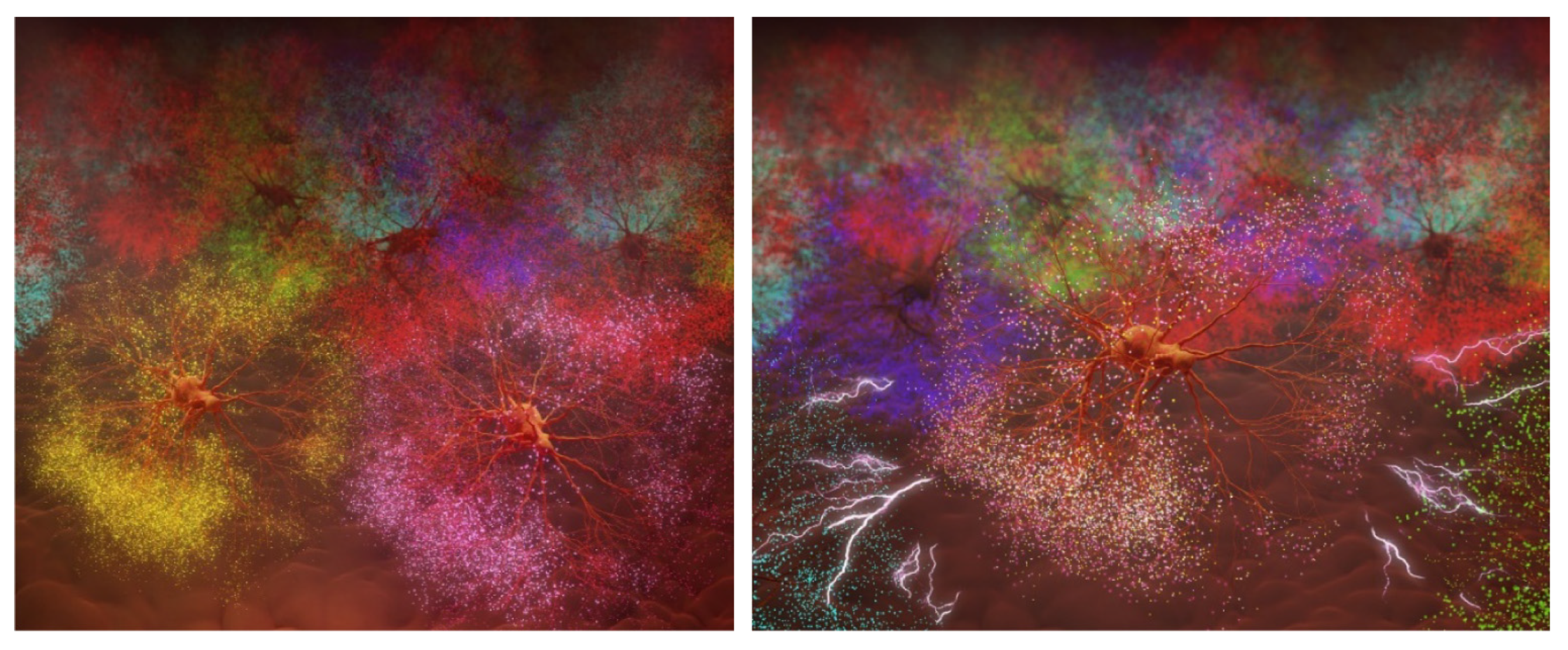 Merger of synaptic cloud with memory. (Artwork by Kevin Heyse, Sage Marketing Group, Denver, CO, using Blender 3D and Photoshop). This is an artist’s impression of the synaptic quantum cloud merging with its corresponding memory. Pre-merger is shown on the left, post-merger on the right.