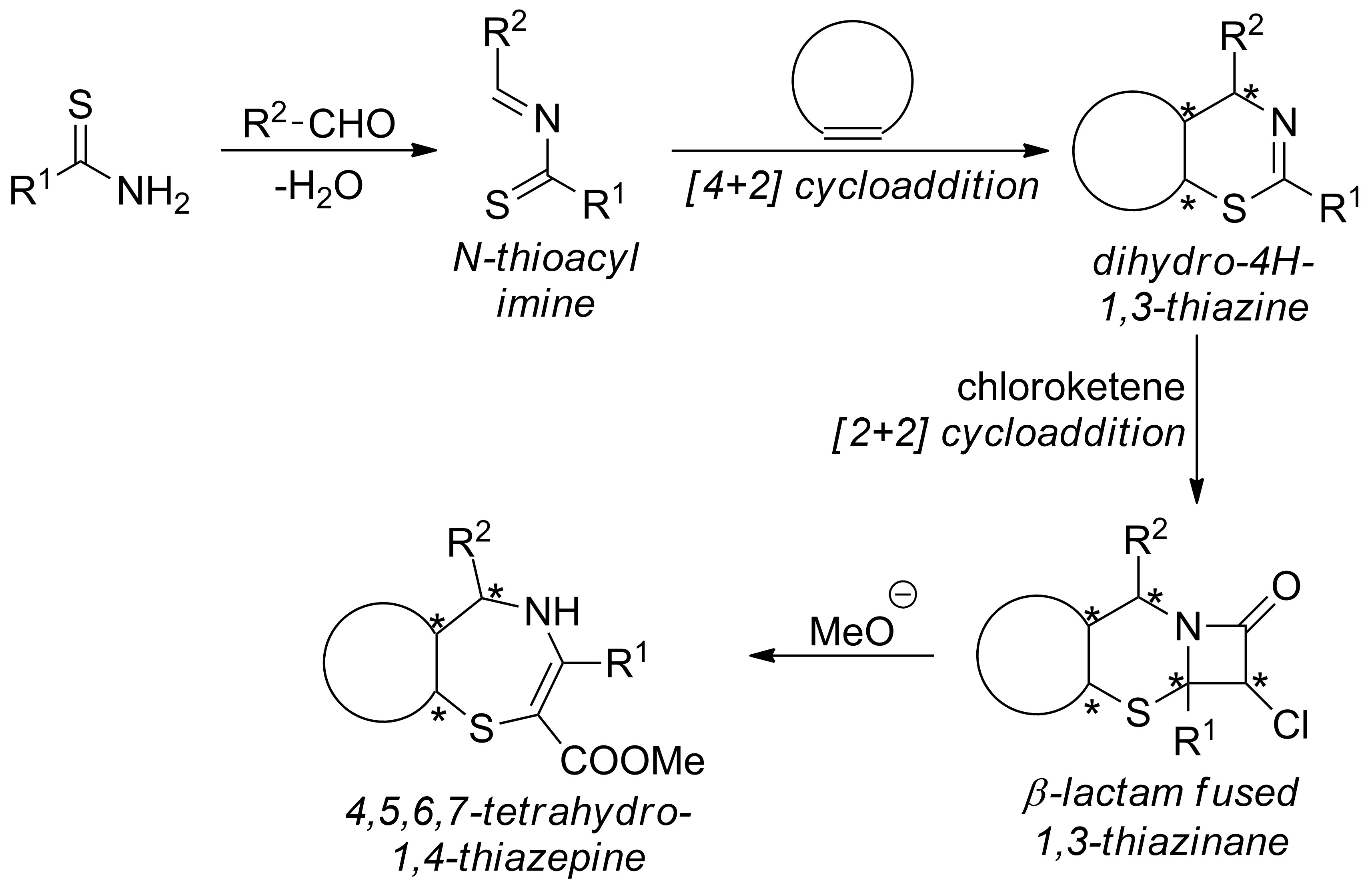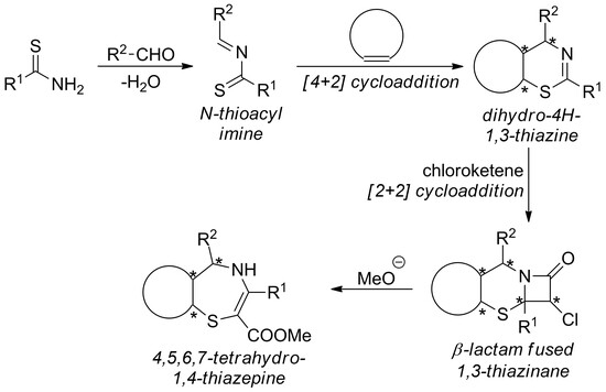 Fodor and coworkers reported that [2+2] cycloaddition of 5,6-dihydro-4H-1,3-thiazines and chloroketene yields chlorinated, β-lactam-fused 1,3-thiazinanes [29,30,31]. They also reported that treatment of the latter compounds (which show some structural similarities with cephems) with alkoxide ions provides 4,5,6,7-tetrahydro-1,4-thiazepines [30,31]. Recently, Peudru et al. improved this pathway by synthesizing the necessary dihydro-1,3-thiazines by the hetero-Diels–Alder reaction of alkenes and in situ generated N-thioacyl imines [32]. This modified pathway enables quick and efficient transformation of alkenes into various sulfur-containing azaheterocycles (Scheme 1).
