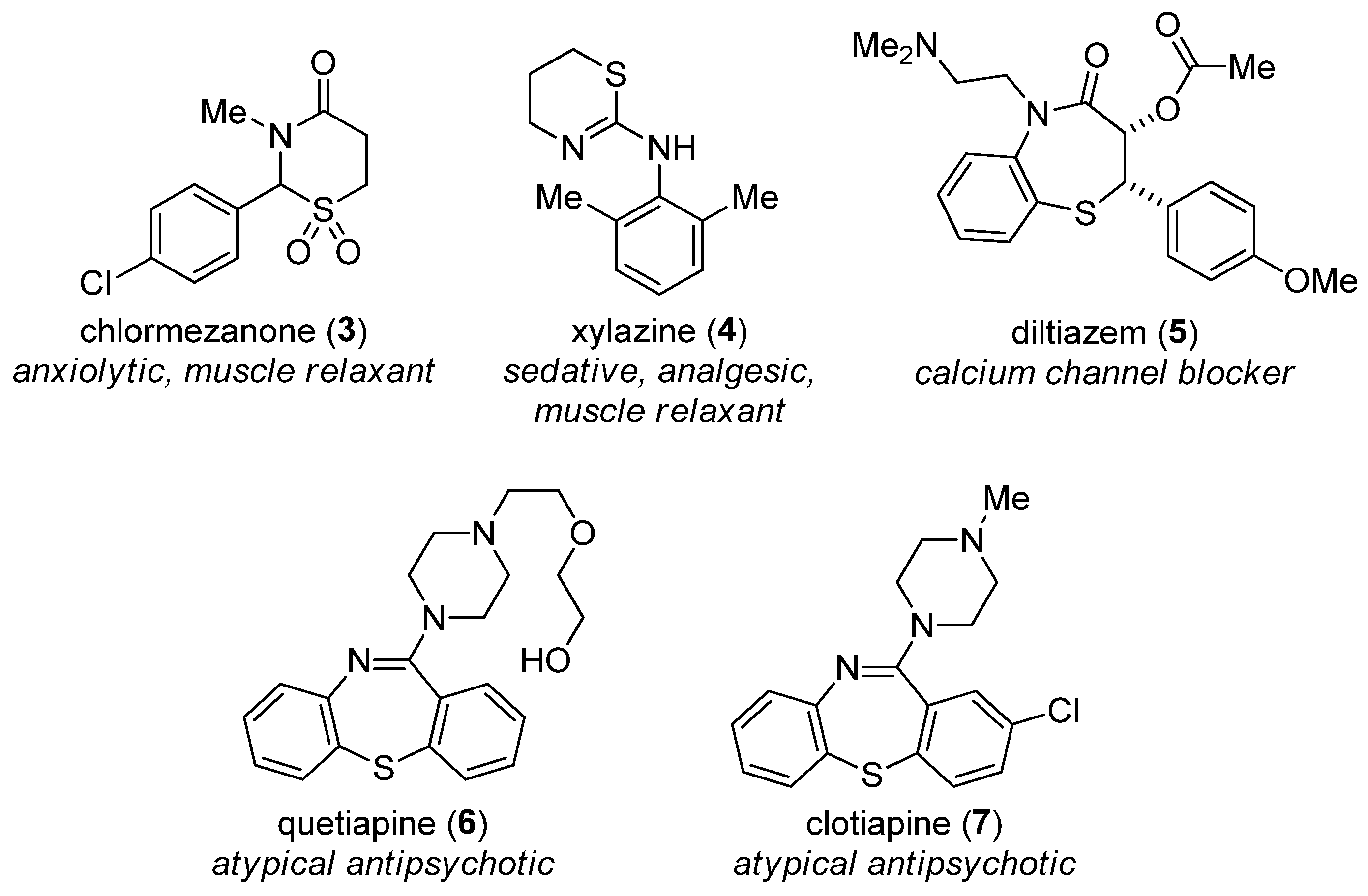 Heterocycles with both nitrogen and sulfur atoms in the ring are also found in pharmaceuticals. The most common related heterocycles are (benzo)thiazoles, penicillins (β-lactam-fused thiazolidine core, see 1 as an example) [3,4,8,9]. Further examples are (benzo)thiophenes, phenothiazines, and cephems (β-lactam-fused dihydro-1,3-thiazine core, see 2 as an example) [3,4,8,9]. It caught our attention that while cephems are relatively common, other drugs with 1,3-thiazine-derived rings (Figure 2) are very rare [8,9,10], despite the fact that a number of 1,3-thiazine derivatives show interesting biological activities [11,12,13,14,15]. Interestingly, 1,4-thiazepine-derived ring systems show a similar tendency. Such motifs are rare in drugs (Figure 2) [8,9], although they are present in many bioactive compounds [16,17,18,19,20,21,22,23,24,25,26,27,28].