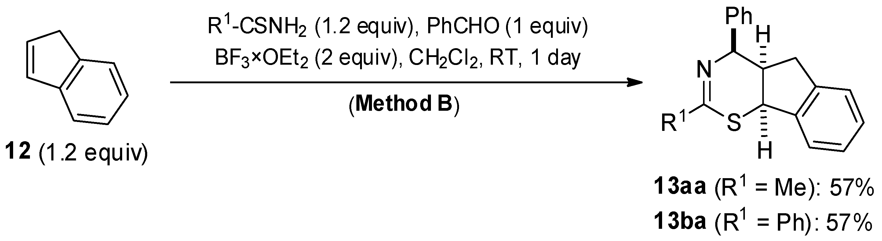 The synthesis of 5,6-dihydro-4H-1,3-thiazines is a three-component, one-pot reaction (see Scheme 1). Thioamides and aldehydes, applied in constructing the N-thioacyl imine heterodienes, were chosen based on availability: thioacetamide (8a, R1 = Me), thiobenzamide (8b, R1 = Ph), and benzaldehyde (9a, R2 = Ph). [Some reactions were also performed with 4-chlorobenzaldehyde (9b, R2 = 4-chlorophenyl)]. The cycloalkane reaction partners were more diverse and included norbornadiene, indene, 1,5-cyclooctadiene, 1,3-cyclooctadiene, and 1,3-cyclohexadiene.