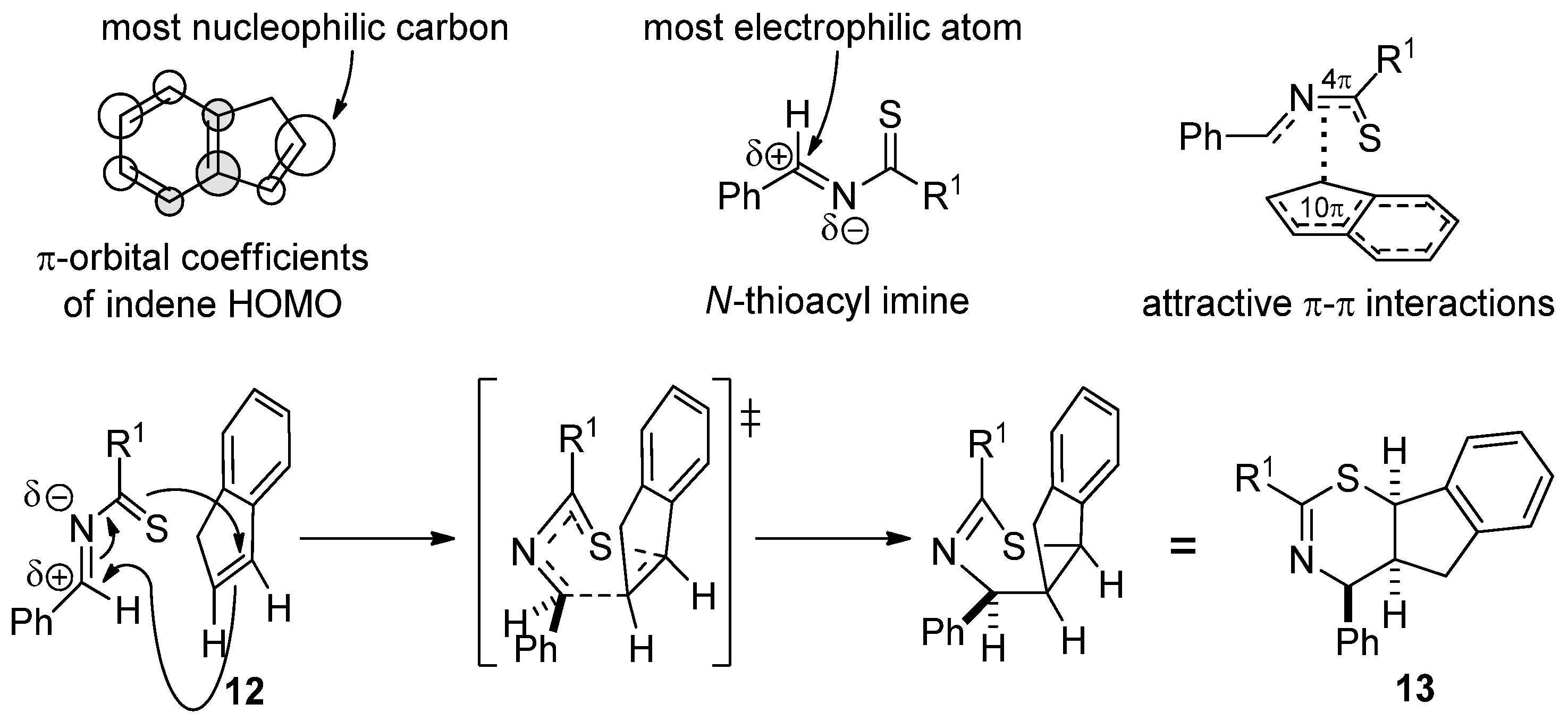 The same regioselectivity was observed in other indene–heterodiene Diels–Alder reactions [33,34]. The regioselectivity can be explained by HOMO–LUMO interactions: the HOMO of indene has the highest coefficients at C-2 (this is the most nucleophilic atom) [35], while the most electrophilic atom of the N-thioacyl imine is the imine carbon (the electronegative nitrogen withdraws electrons from it via both –I and –M effects). Based on the stereochemistry, the heterodiene performs an endo attack. Presumably, energetically favorable π–π interactions between the π-electron systems of indene and N-thioacyl imine are responsible for orienting the heterodiene. The above considerations are summarized in Scheme 6.