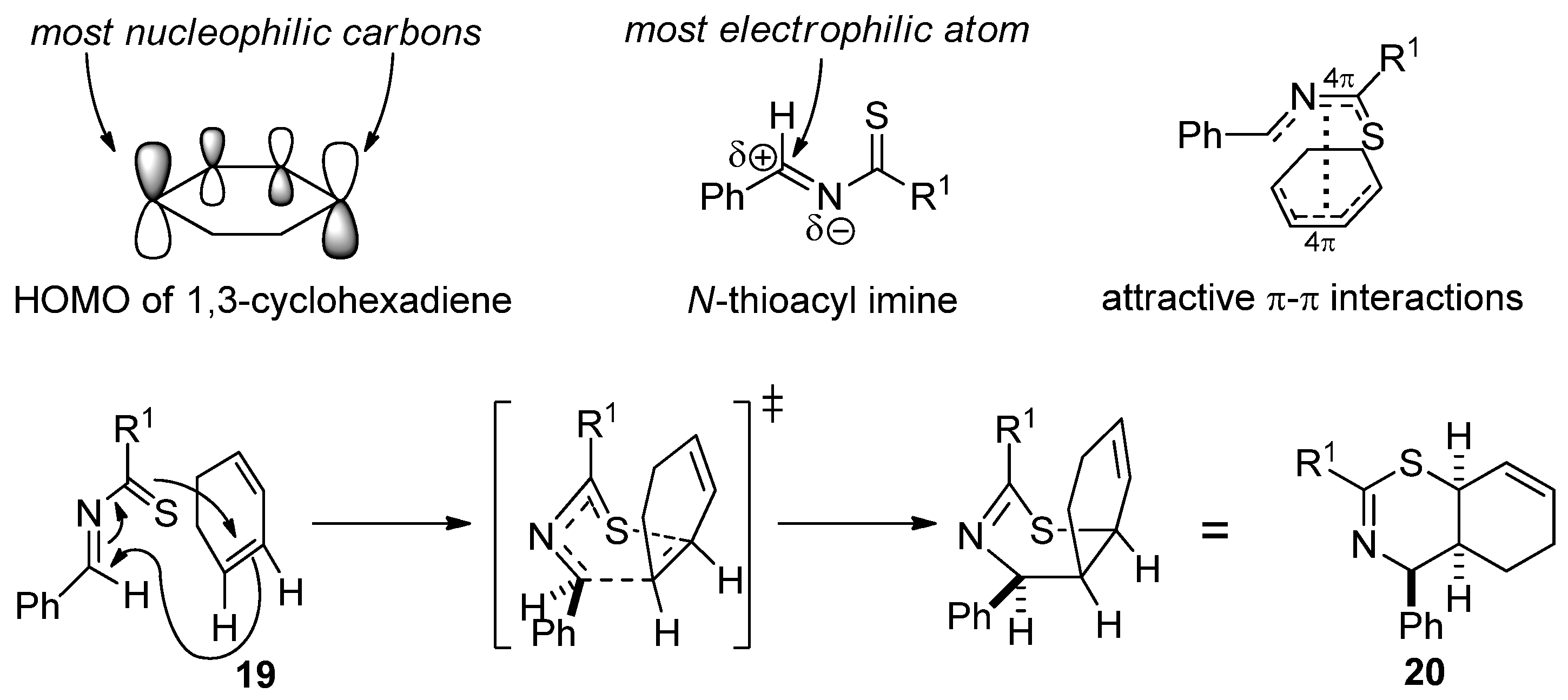 The same regio- and stereoselectivity was observed in the hetero-Diels–Alder reactions of 1,3-cyclohexadiene and α-keto-β,γ-unsaturated phosphonates such as (E)-diethyl cinnamoylphosphonate [36]. The regioselectivity can be explained by HOMO–LUMO interactions: the HOMO of conjugated dienes has the highest coefficients at the ends of the conjugated system (these are the most nucleophilic atoms) [37], while the most electrophilic atom of the N-thioacyl imine is the imine carbon (the electronegative nitrogen withdraws electrons from it via both –I and –M effects). The endo stereoselectivity can be explained by the favorable π–π interactions between the conjugated electron systems of the heterodiene and the cyclodiene. These factors are summarized in Scheme 10.