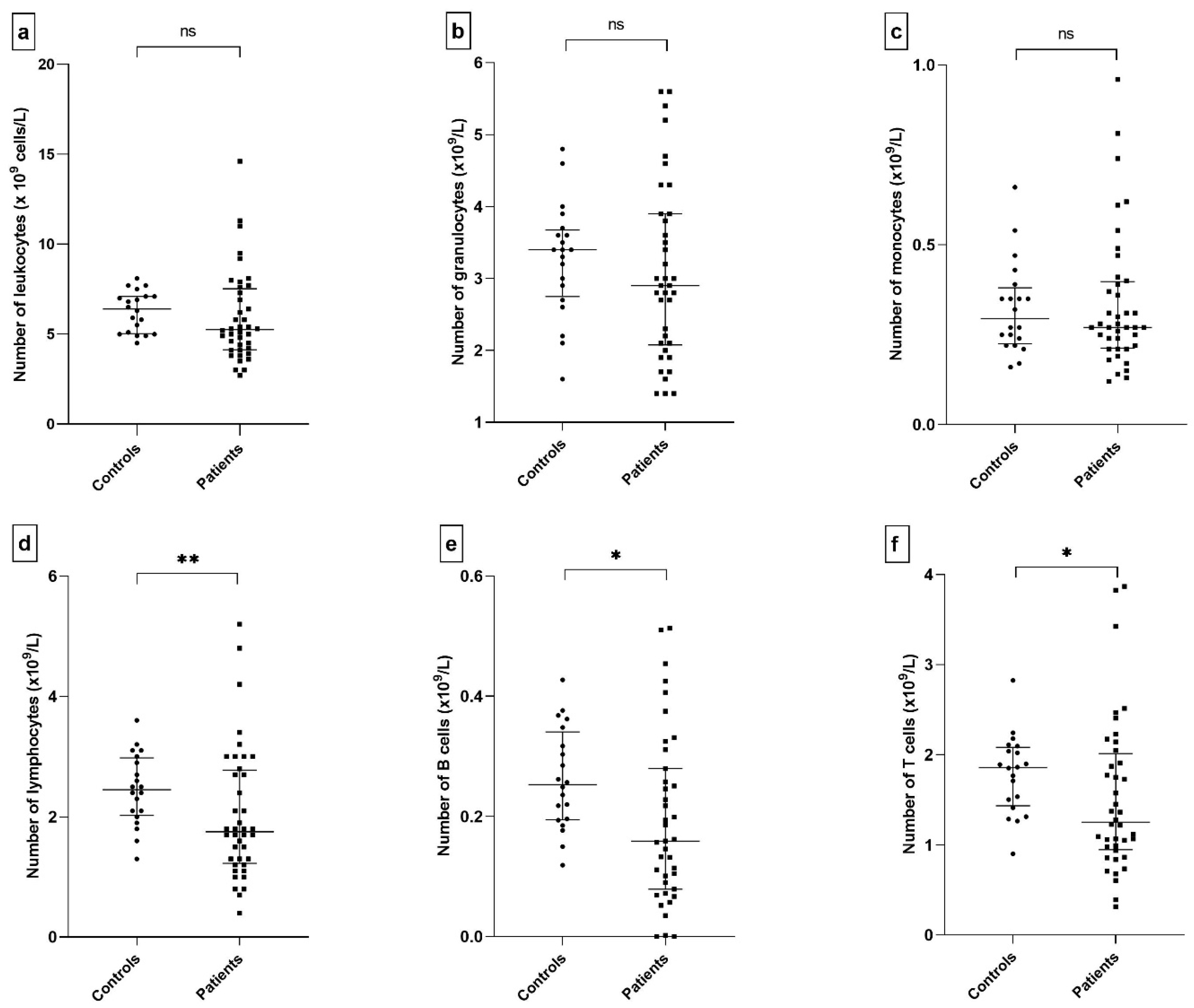 - Davies, R.; Hammenfors, D.; Bergum, B.; Jakobsen, K.; Solheim, M.; Vogelsang, P.; Brun, J.G.; Bryceson, Y.; Jonsson, R.; Appel, S. Patients with Primary Sjögren’s Syndrome Have Alterations in Absolute Quantities of Specific Peripheral Leucocyte Populations. Scand. J. Immunol. 2017, 86, 491–502. [Google Scholar] [CrossRef] [PubMed]
