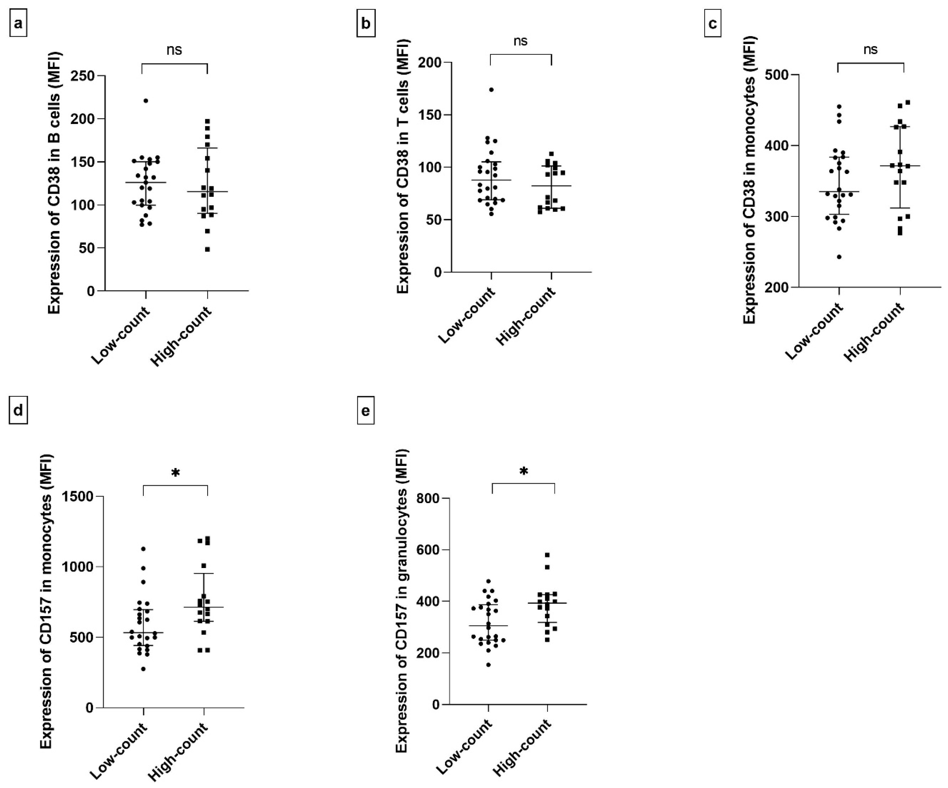 2.3. The Expression of CD157 and CD38 on the Cell Surface
