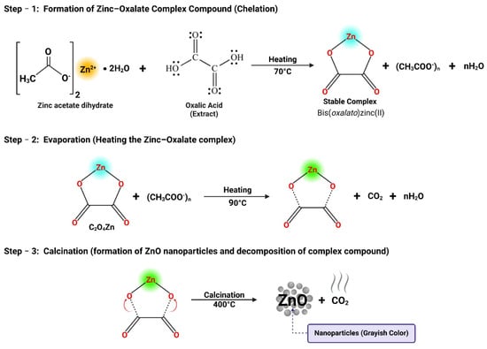 Proposed reaction mechanism for the formation of ZnO using natural extract as precursor. The scheme summarizes the sequential steps involved: chelation of zinc ions to form a zinc–oxalate complex, solvent evaporation upon heating, and subsequent calcination leading to the decomposition of the coordination compound and the formation of ZnO nanoparticles.