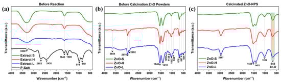 (a) FTIR spectra of Agave tequilana extracts and precursor salt, (b) spectra of ZnO powders before calcination, and (c) spectra of calcinated ZnO-S, ZnO-H, and ZnO-L samples.