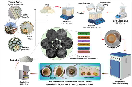 Schematic representation of the green synthesis process used to obtain ZnO nanoparticles from natural extracts derived from different parts of the Agave tequilana plant. The diagram illustrates the preparation of the extracts, their reaction with the zinc precursor, and the subsequent steps leading to the formation of ZnO-NPs.