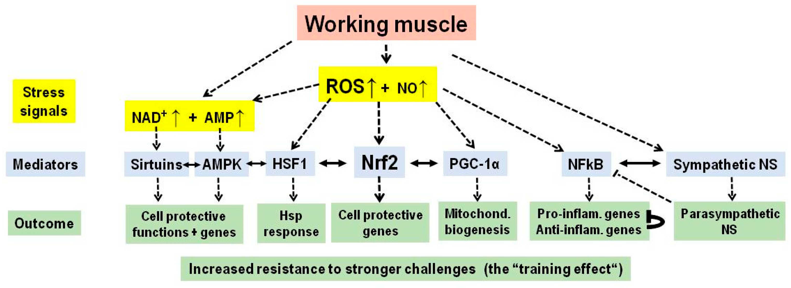 | Exposure to heat [62,63,64,65,66,67,68,69,70,71,72] | SNS, ROS, NAD+, AMP | PNS, Nrf2, HSF1, PGC-1α, NFkB | Cardiovascular function |