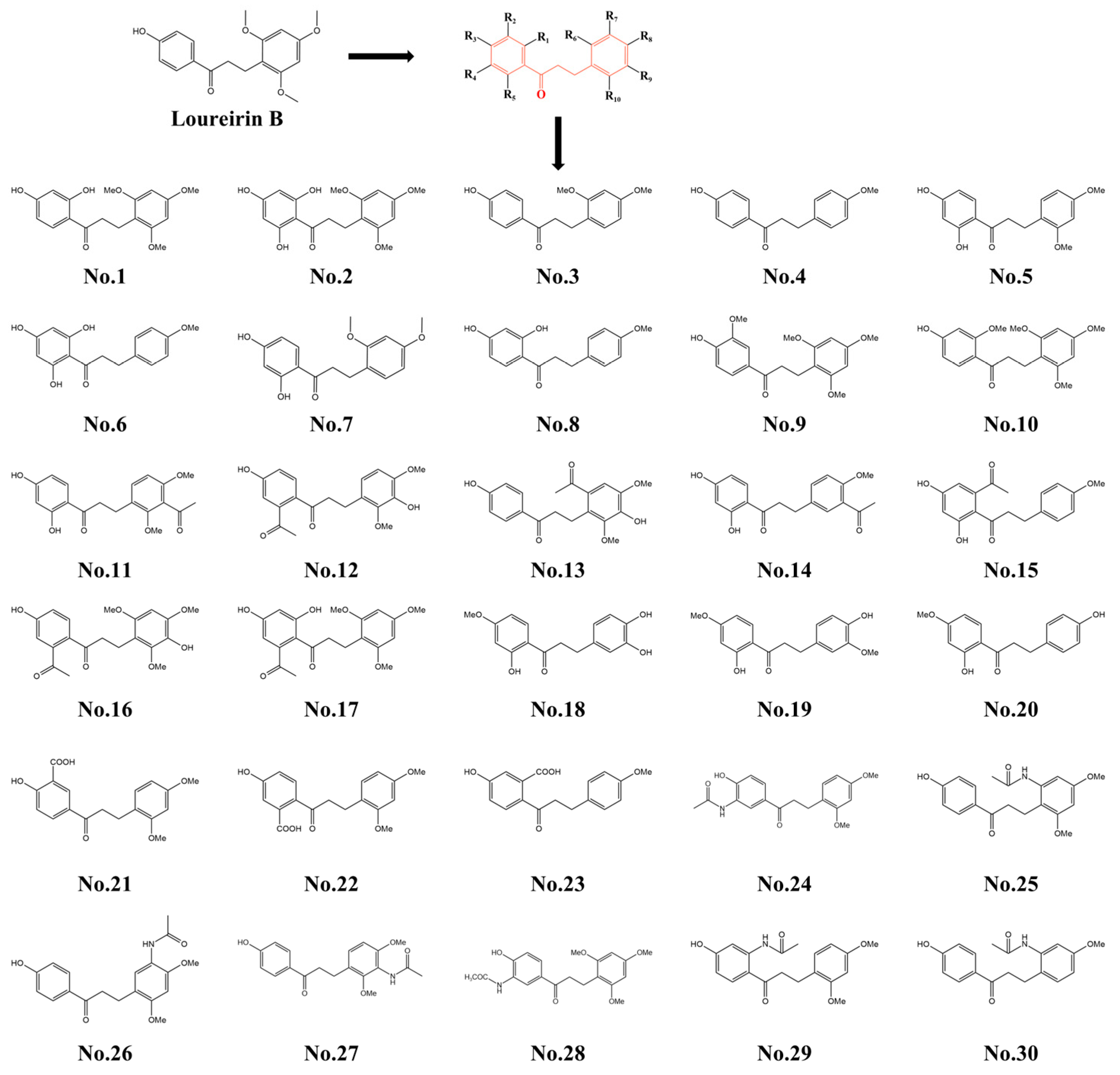 2.1. Screening and Synthesis of the Molecular Structures of Loureirin B Analogs
